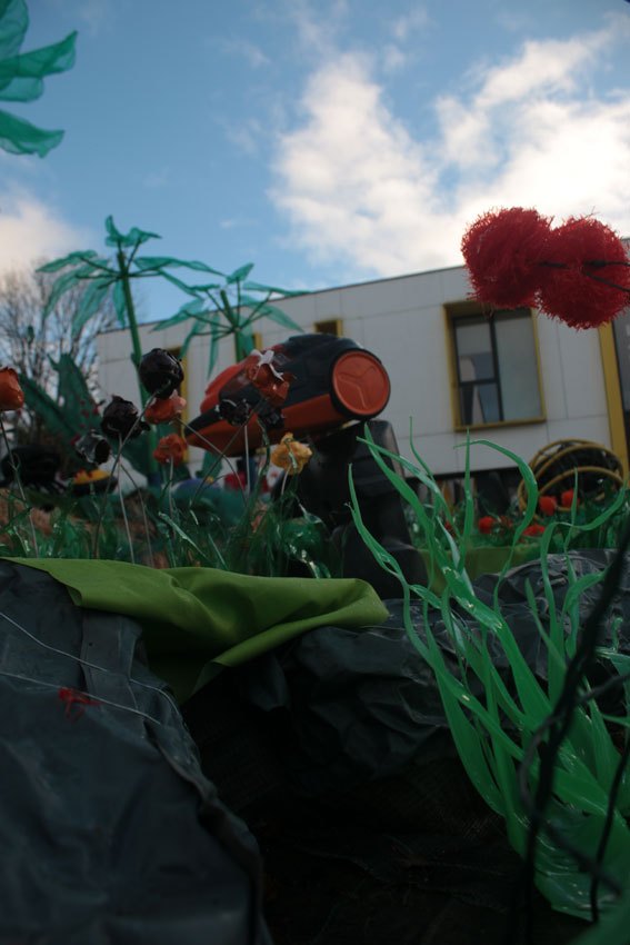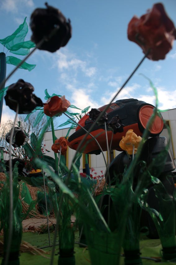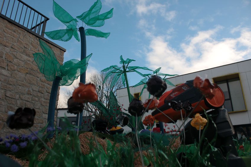 Les fleurs ont été fabriquées avec des pots de yaourts, crème desserts, petits suisses.. déformés à chaud; les filets de légumes ligaturés, chauffés, tirés, roulés. Pour structurer mettre sur tige, il y a un casier de bouteilles mais surtout du grillages et des bordures de jardin qui permettent des variétés de fleurs hautes, rampantes, tombantes…