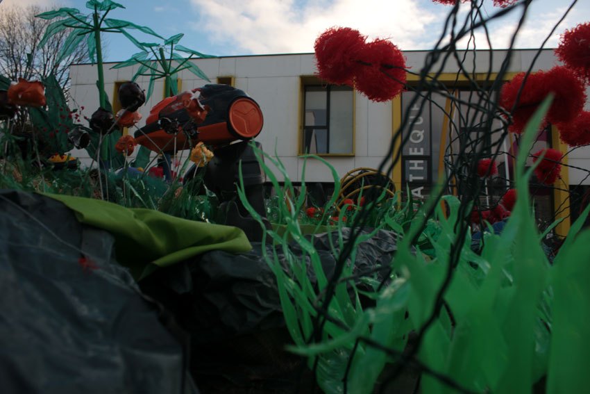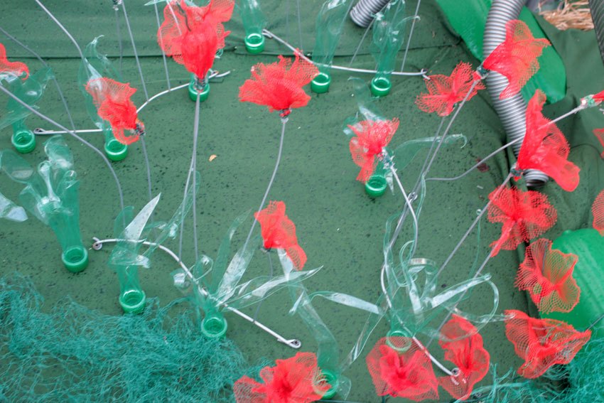 Recherche de végétaux : herbes, fleurs, algues, coraux… avec des déchets ménagers, vhs, bâches… Recherche de techniques sur les plastiques, les ligatures…