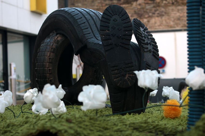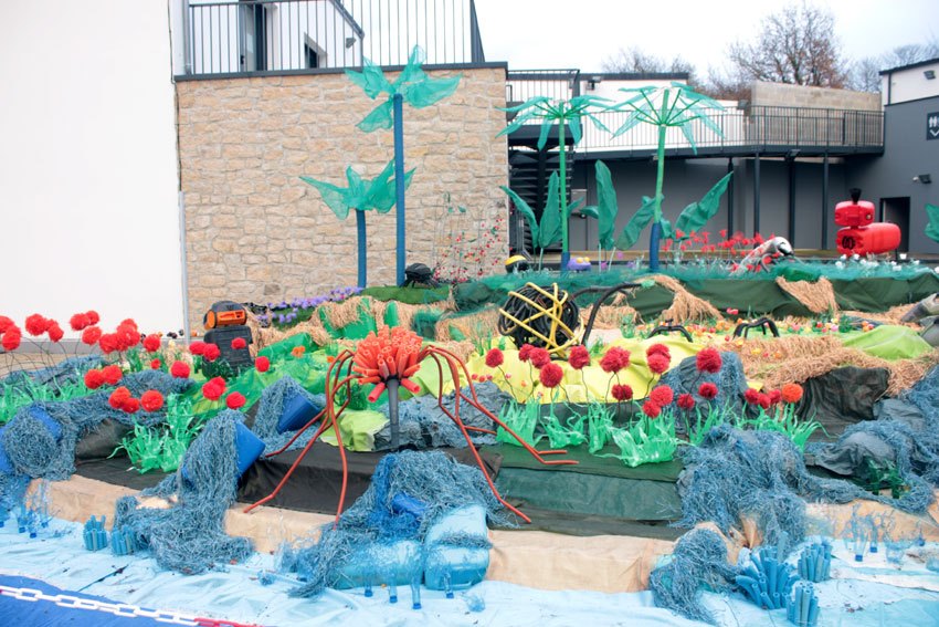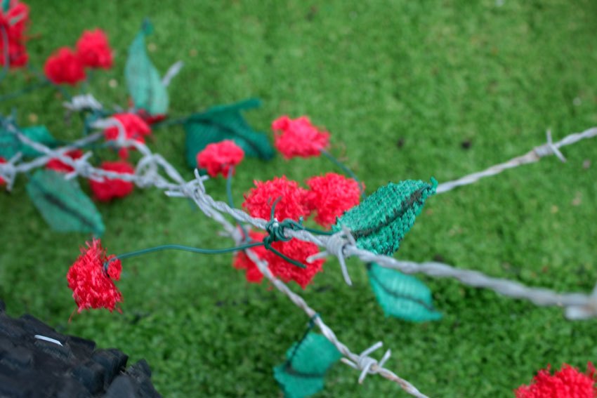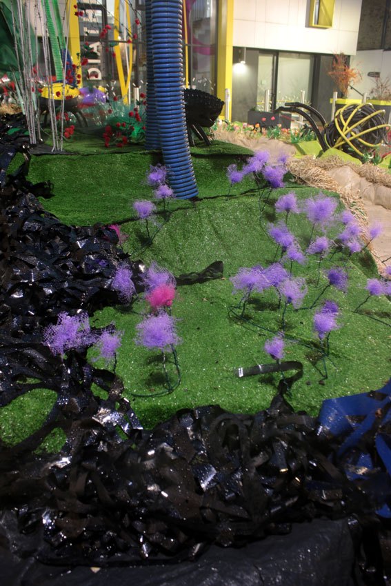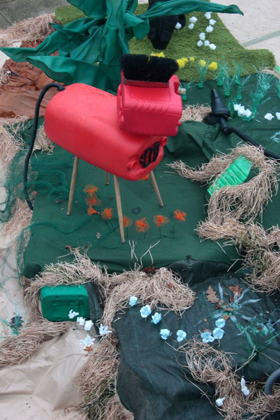 L’herbe verte en bouteille et bidons de pétroles lacérés et chauffés. Les arbres en filets de jardin structurés par des fils de fer, montés sur des grilles de sèche linge. Les ronciers en fils barbelés et petite fleurs-baies en filet de légume permettent de sécuriser la falaise.