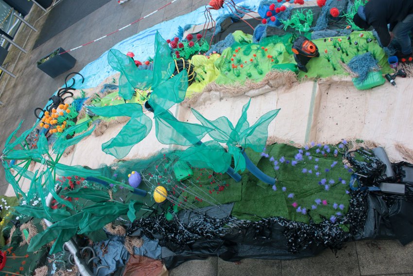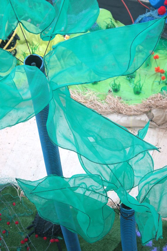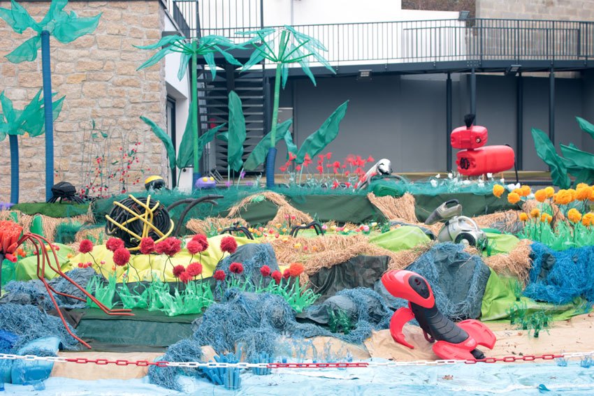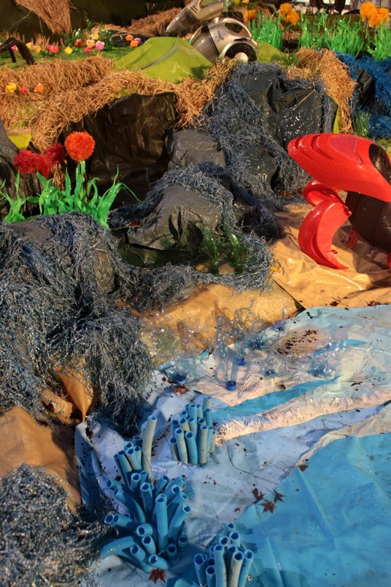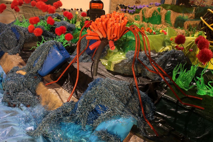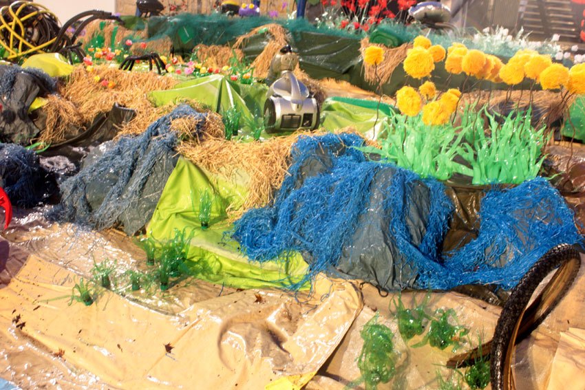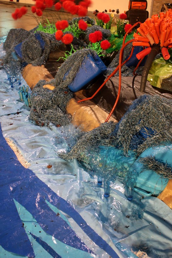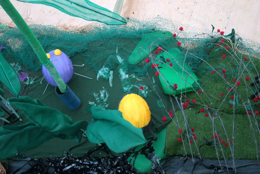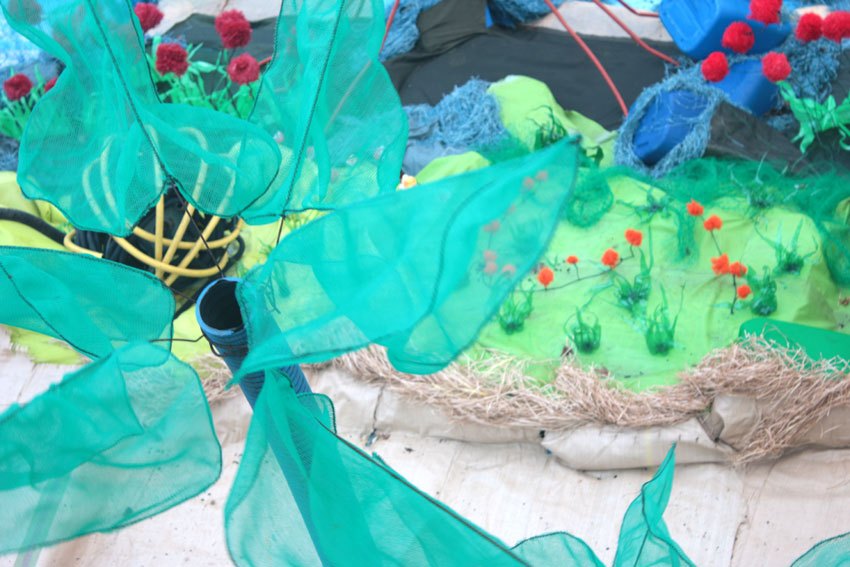 Des bâches bleues complètement explosées, une fois détissées ont permis de faire de belles algues dégoulinantes. Les Bandes VHS fixées au point noué sur du grillage faisaient des algues noires à l’arrière de l’île, malheureusement elles n’ont pas gardé le tombant, vite elles se sont nouées.
