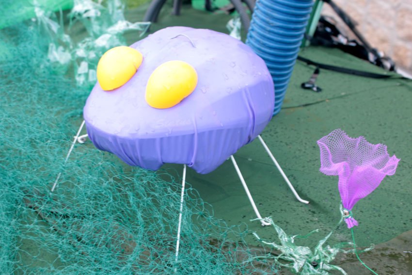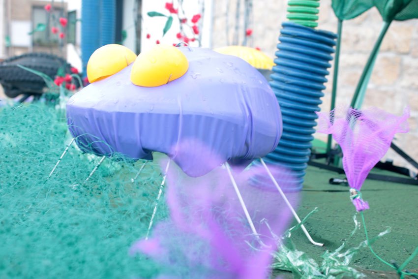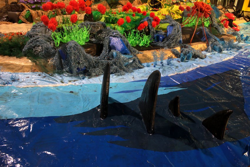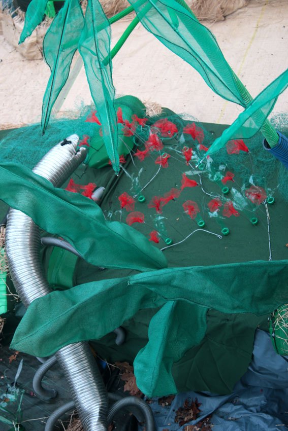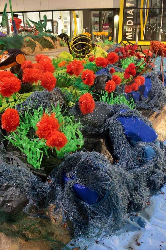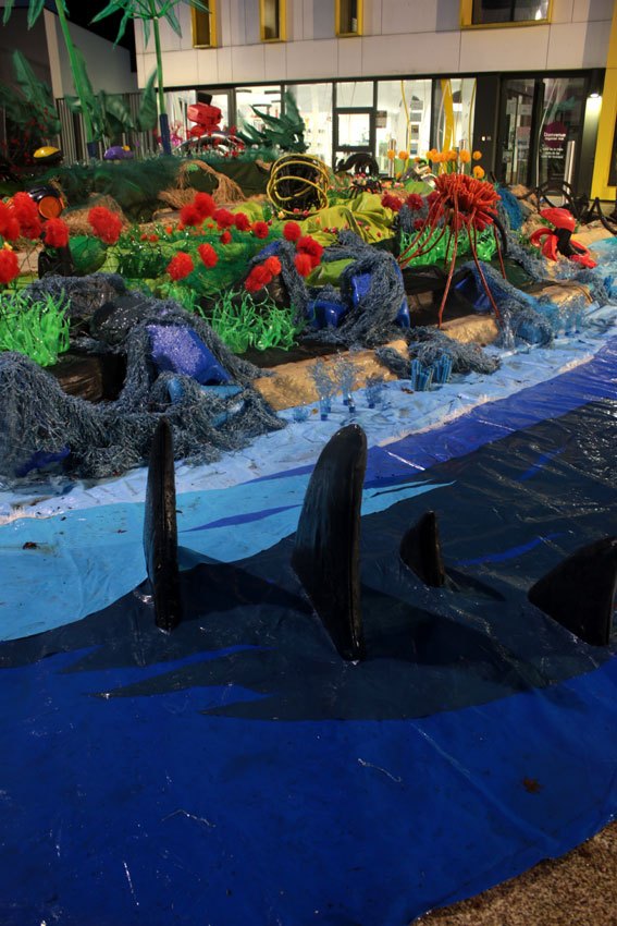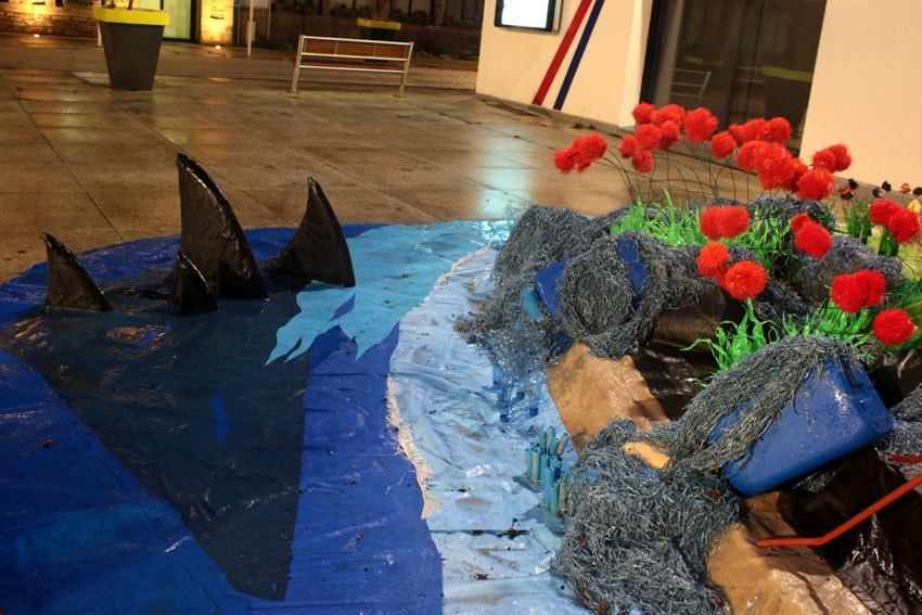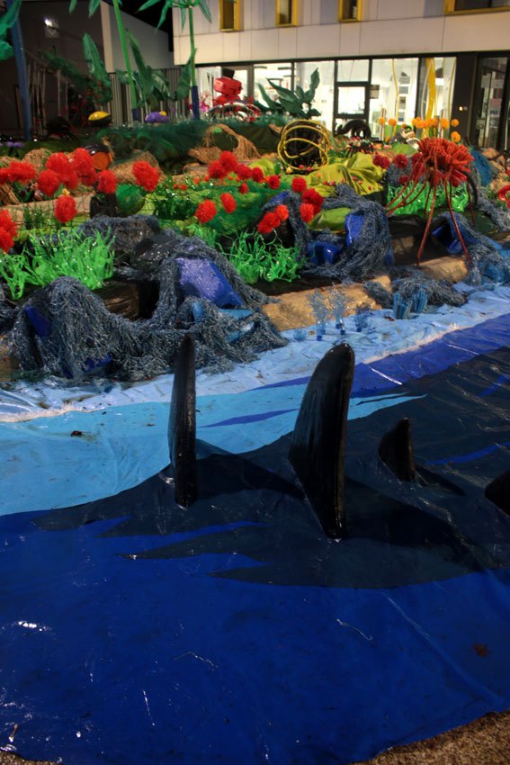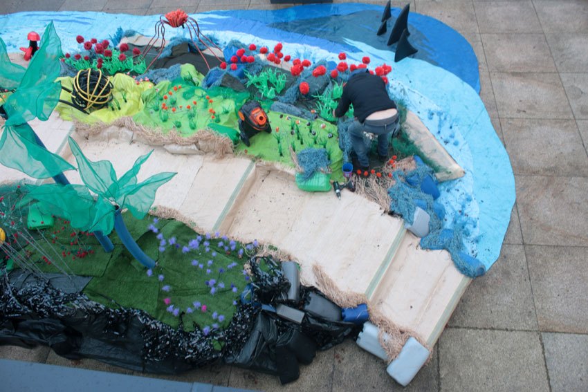 Des bâches bleues complètement explosées, une fois détissées ont permis de faire de belles algues dégoulinantes. Les Bandes VHS fixées au point noué sur du grillage faisaient des algues noires à l’arrière de l’île, malheureusement elles n’ont pas gardé le tombant, vite elles se sont nouées.