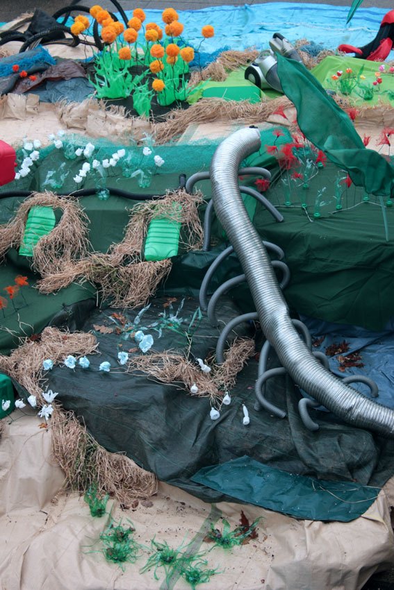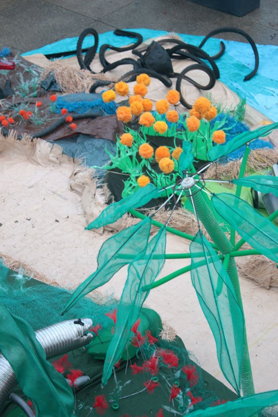 Recherche de végétaux : herbes, fleurs, algues, coraux... avec des déchets ménagers, vhs, bâches... Recherche de techniques sur les plastiques, les ligatures...