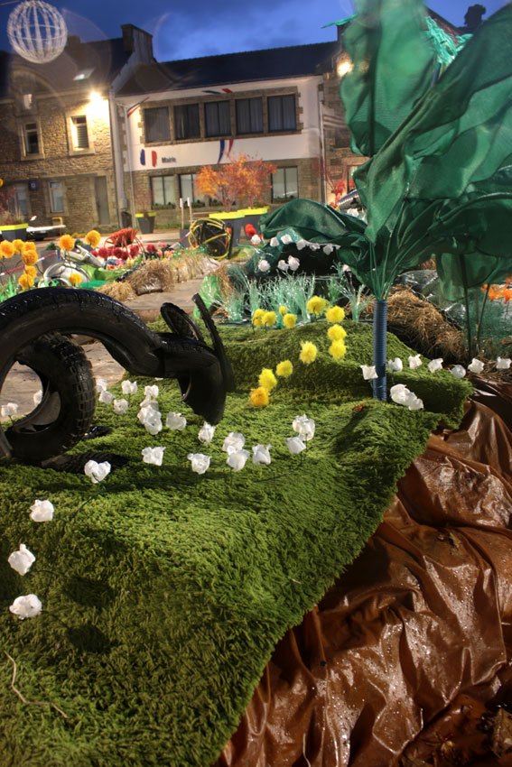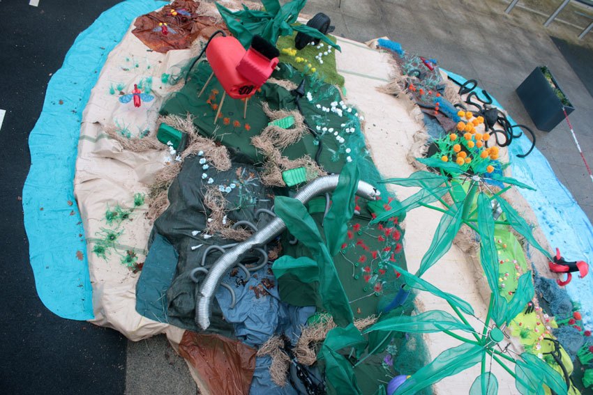 Résidence, recherche avec la communauté de commune centre Morbihan à Saint-Jean-Brévelay, novembre 2021. Création d'une île en déchets, recyclage de déchets ménager, encombrants... avec la déchetterie de Saint-Jean-Brévelay et les habitants.
