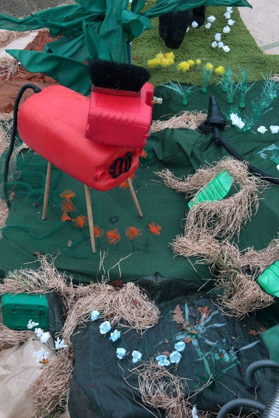 Les règles du jeux étaient de faire avec ce qui était jeté à la déchetterie, il n’y avait pas beaucoup de matière couvrante verte, coup de chance une exploitation de houblon venait jeter ses bâches, elles ont permis de couvrir le chemin, couvrir des bidons rochers, détissées pour l’herbe fine, quand elles sont détissées et chauffées on s’approche réellement de l’aspect sec de l’été, du foin.