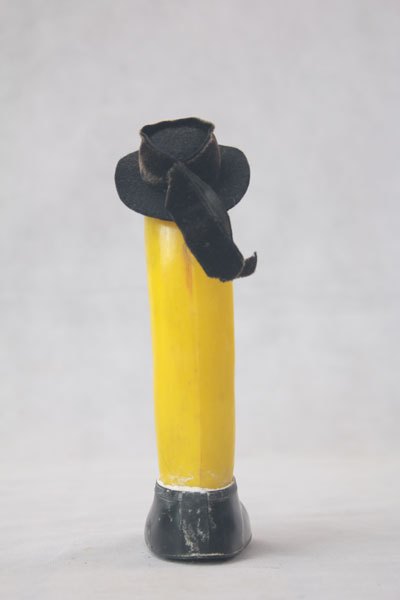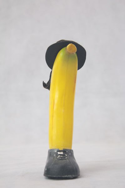 Banane bretonne Assemblage fruit décoratif en plastique, chaussure et chapeau de poupée.