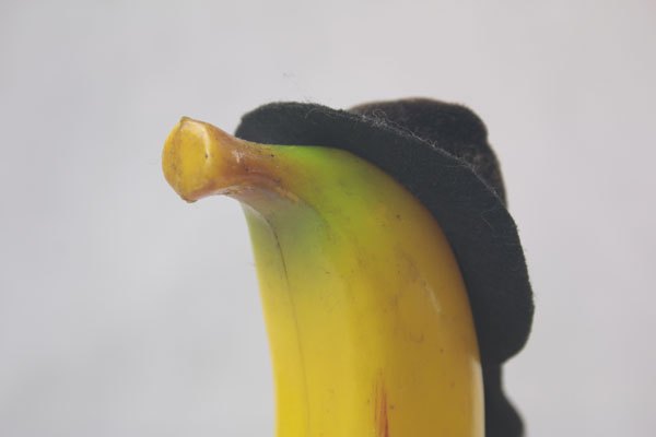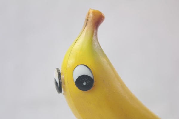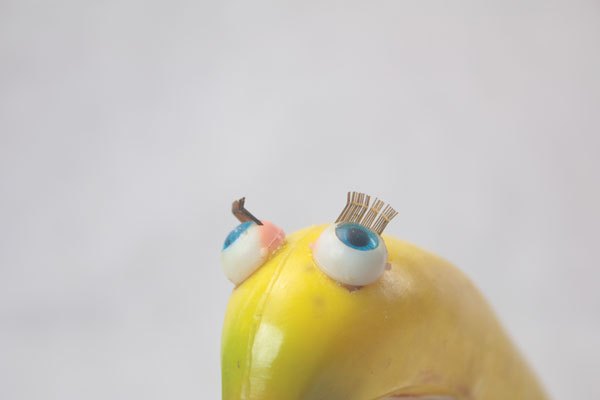 Bestiole banane à quatre pattes. Assemblage d’un fruit décoratif, 2 paires de jambe et deux grand yeux de poupée.