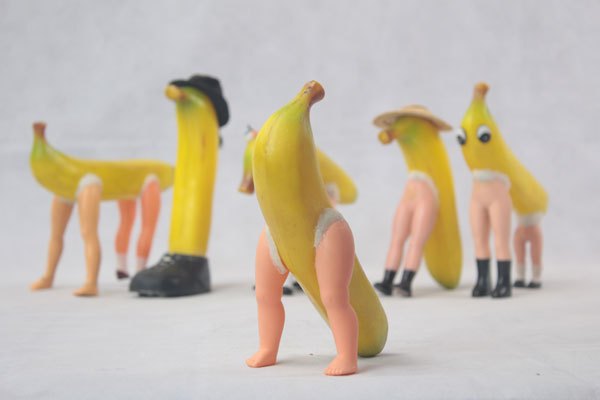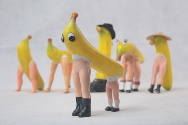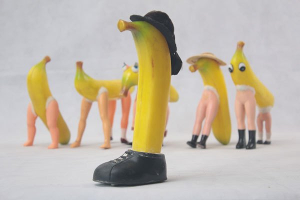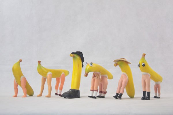 Assemblages avec bananes décoratives en plastique, jambes de poupée, yeux, chapeaux.