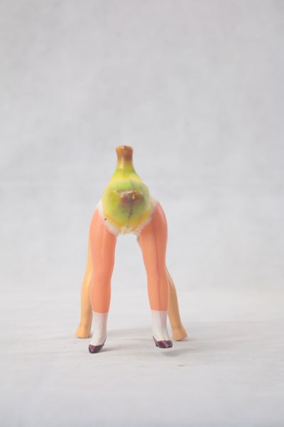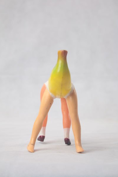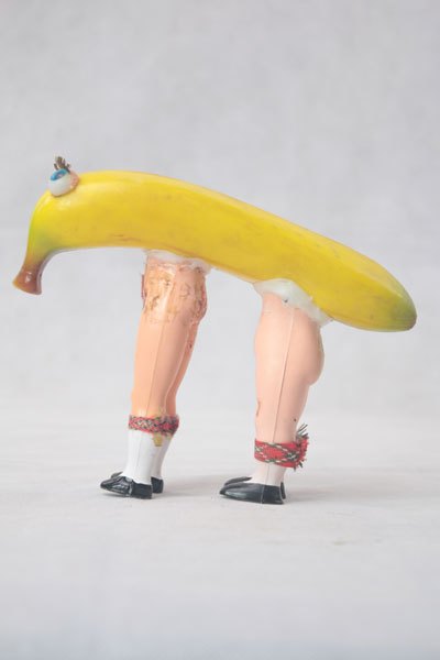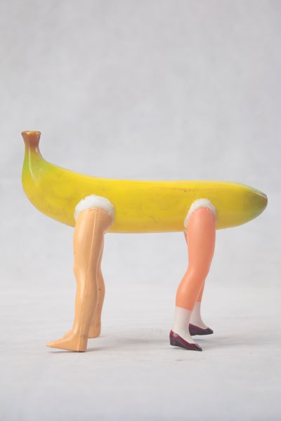 Banane à jambes féminines masculines, à contre sens. Assemblage d’objets.