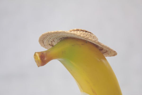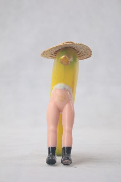 Banana hat, assembly of a decorative plastic fruit, doll legs and doll hat.