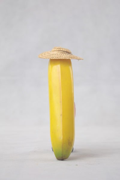 Banane chapeautée, assemblage d’un fruit décoratif en plastique, jambes de poupée et chapeau de poupée.