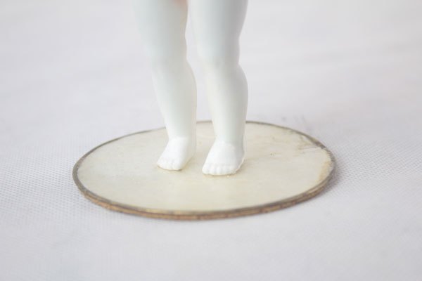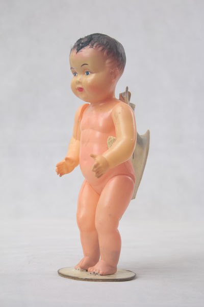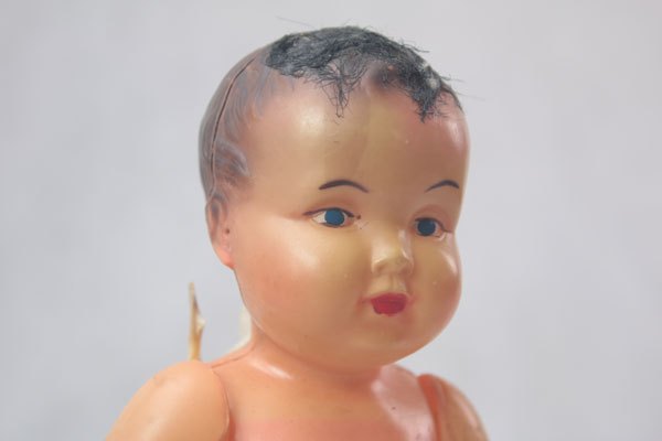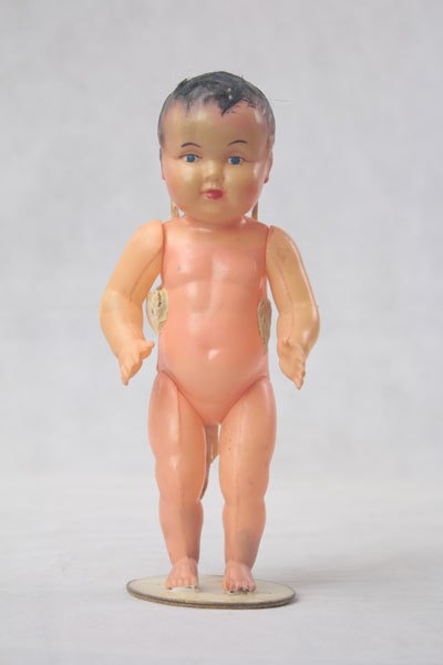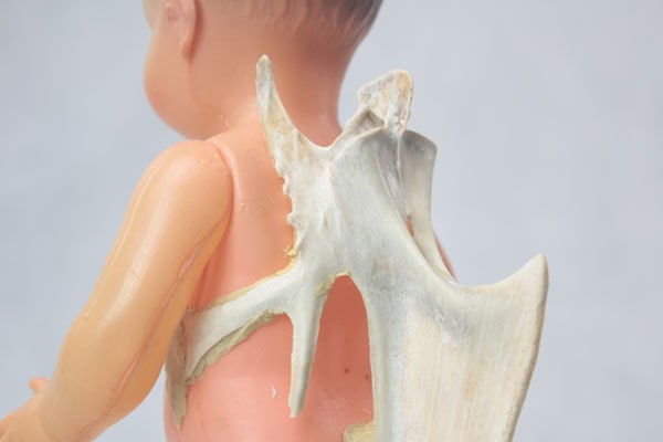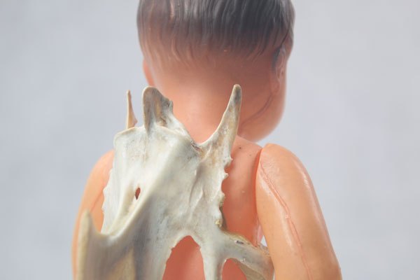 Baby and exoskeleton, assembly of a doll and a chicken fin on a pearl coaster.