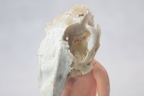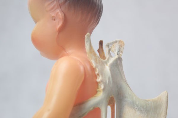 Bébé et exosquelette, assemblage d’une poupée et d’un aileron de poulet sur un sous verre nacré.