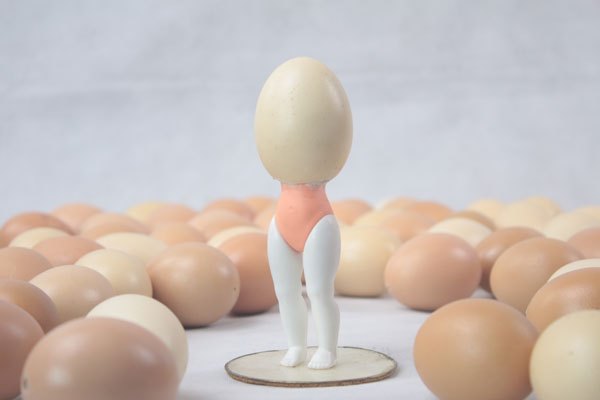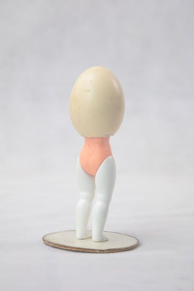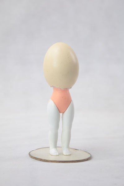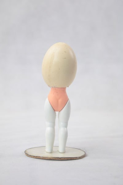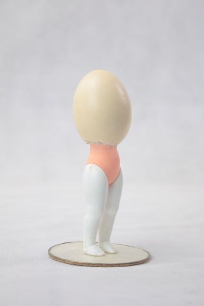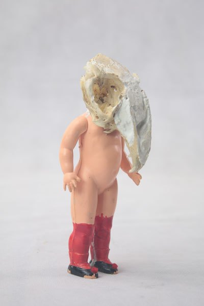 Bébé oeuf, assemblage d’une poupée et d’un oeuf sur un sous verre. Plastique, nacre, liège, calcaire, ciment.