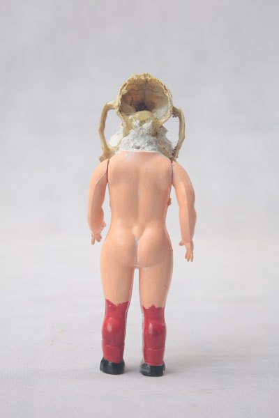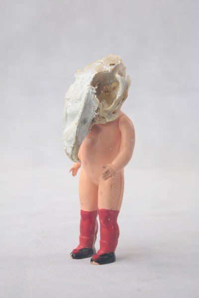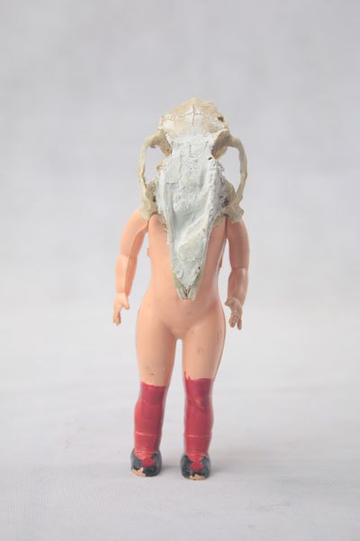 Personnage chimérique, assemblage poupée et tête de lapin.