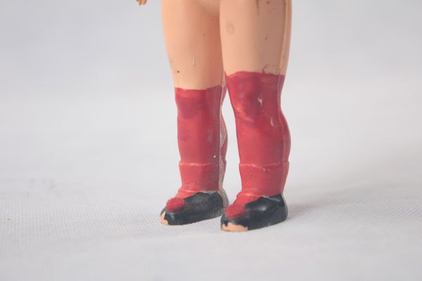 Composition: banane décorative en plastique, jambes de poupée et chapeau de poupée.