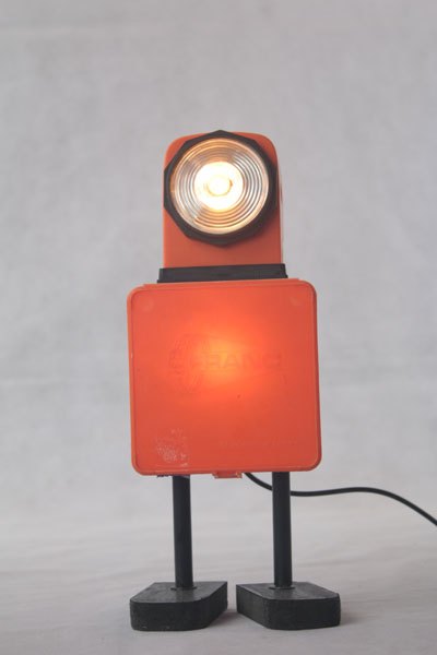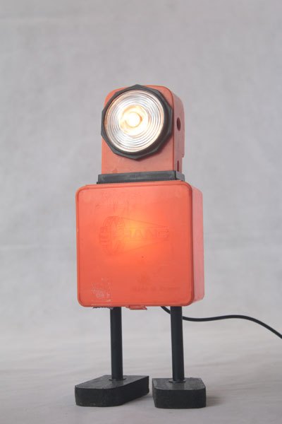 Orange robot with vintage objects. Assembly of a travel lamp and a box of plumbing collars « Franc ». Sculpture, pop art.