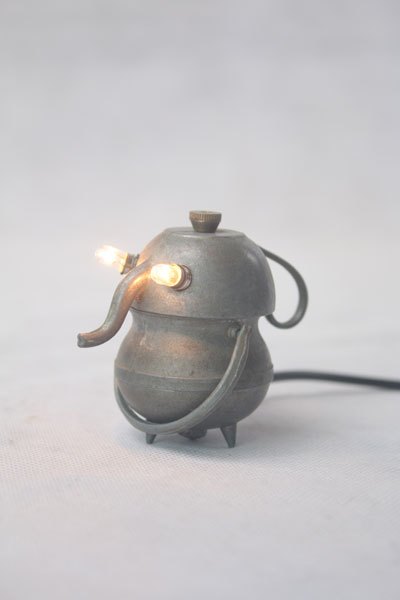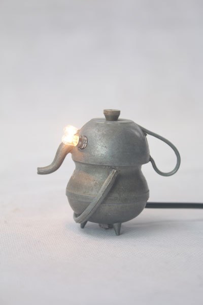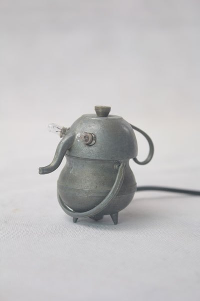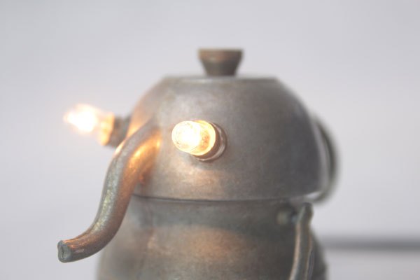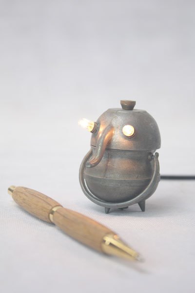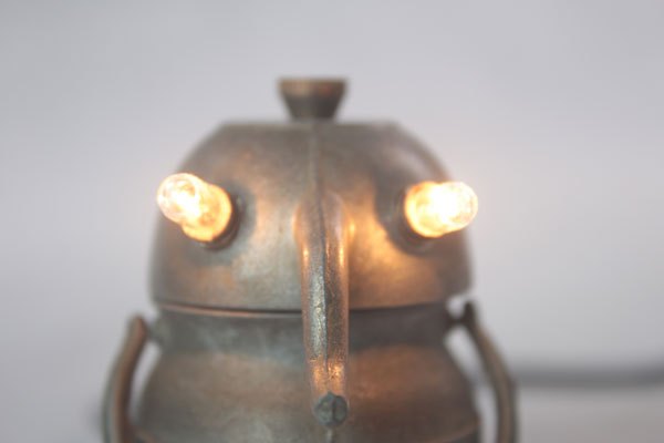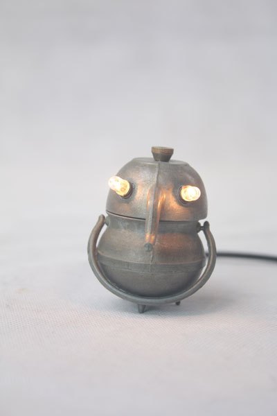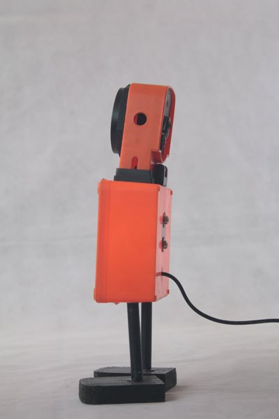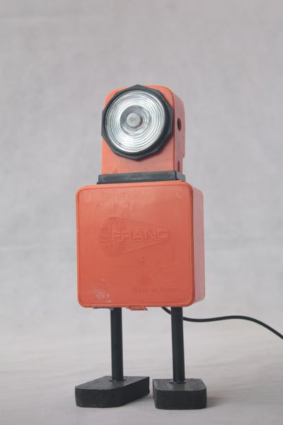 Robot orange avec objets vintages. Assemblage d’une lampe de voyage et d’une boite de colliers de plomberie « Franc ».