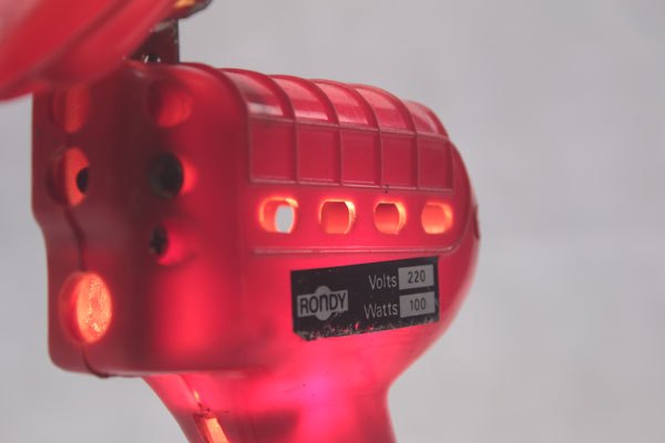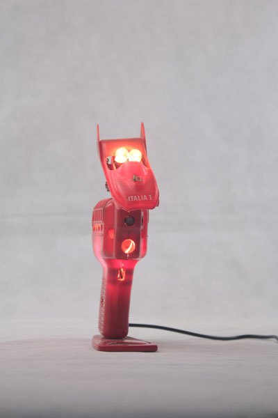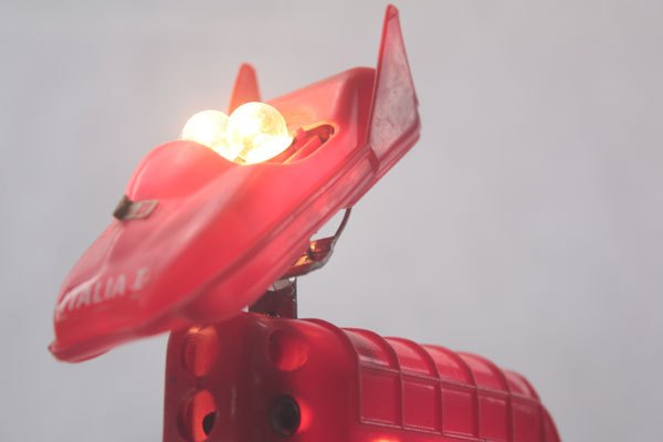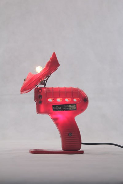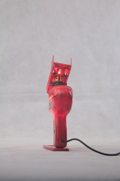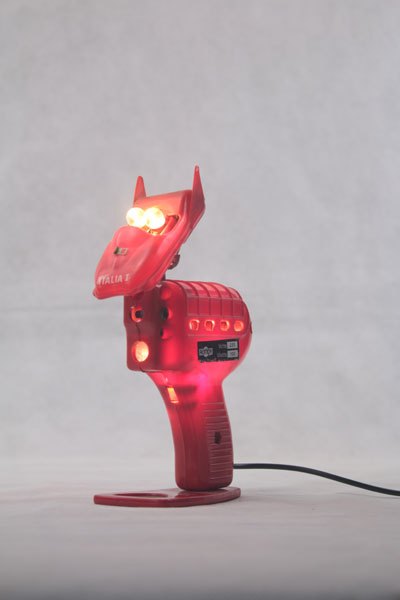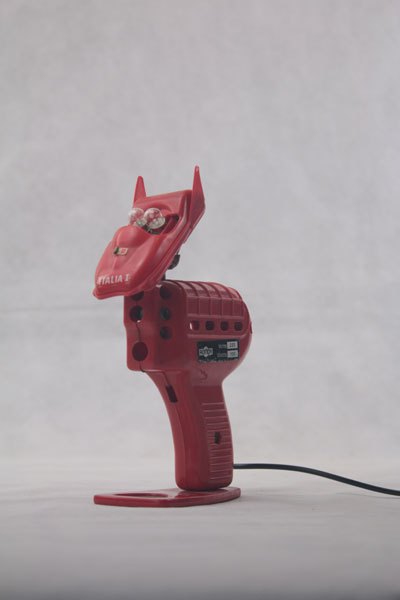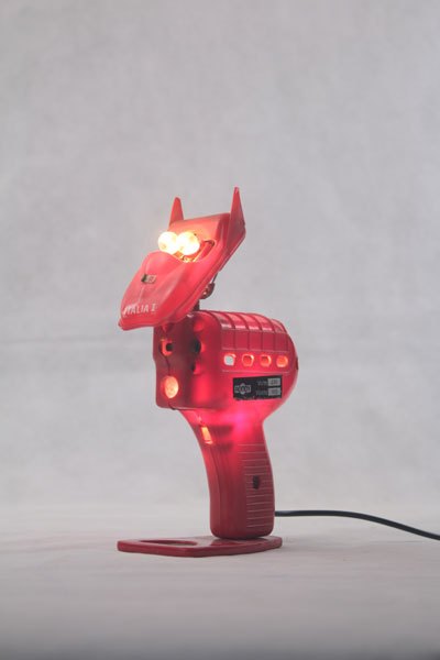 Animal lumineux à corne rouge, assemblage d’objets. jouet, pistolet à souder HS, décapsuleur « Varillon ». Rouge. Recyclage et détournements.