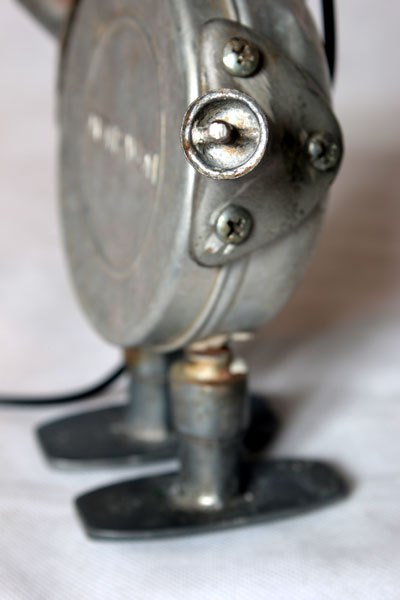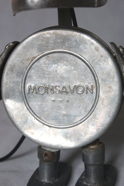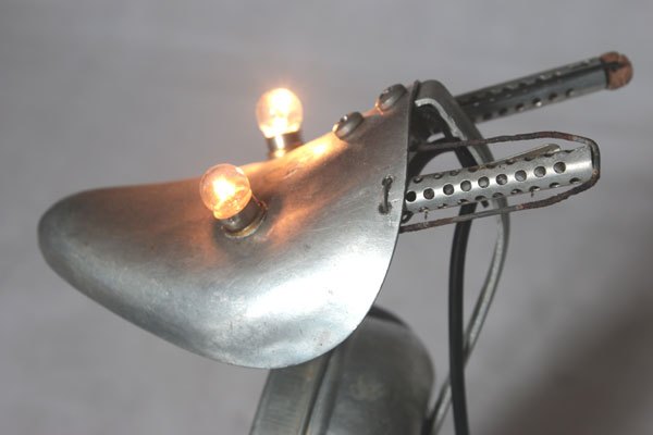 Sculpture lumineuse en aluminium. Assemblage d’un embauchoir, une boite à savon « Monsavon », deux poignées de fenêtre et de casserole et deux bigoudis .