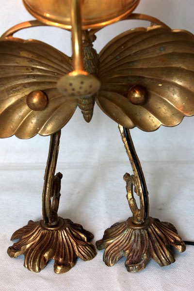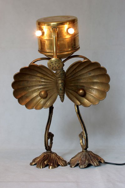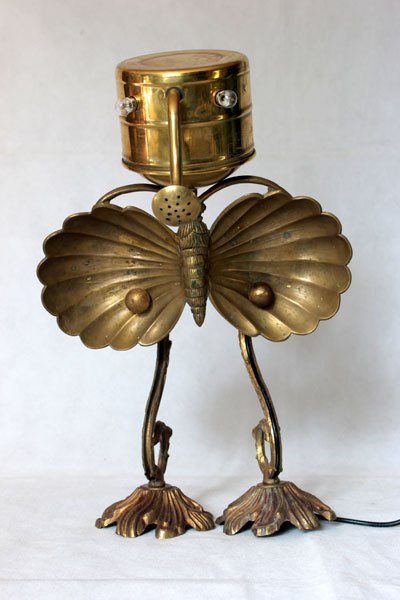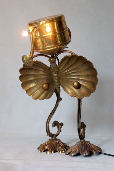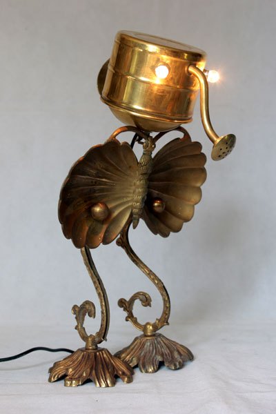 Animal en laiton, assemblage d’un arrosoir. assiette apéro en forme de papillon, pavillon et branche d’applique.
