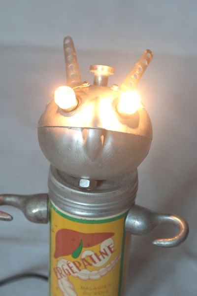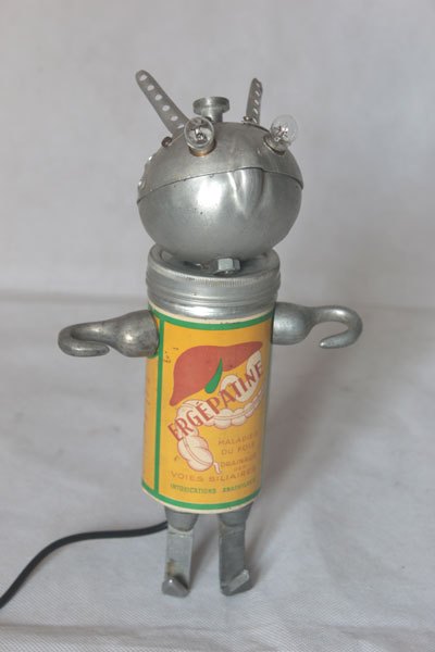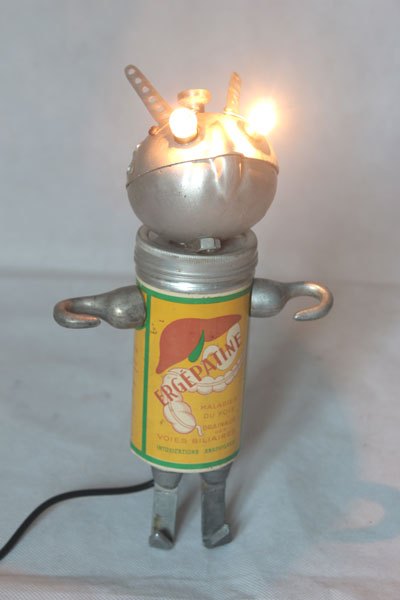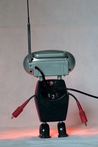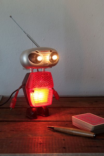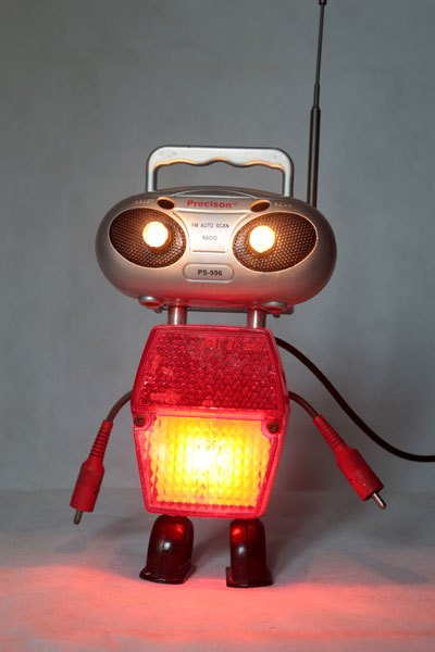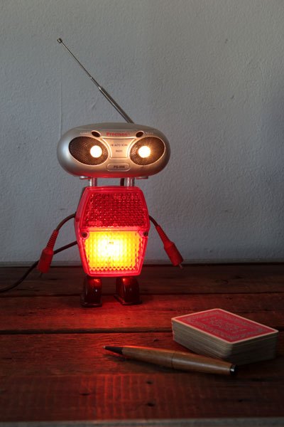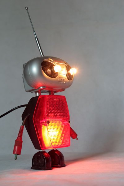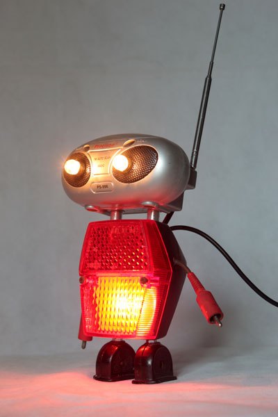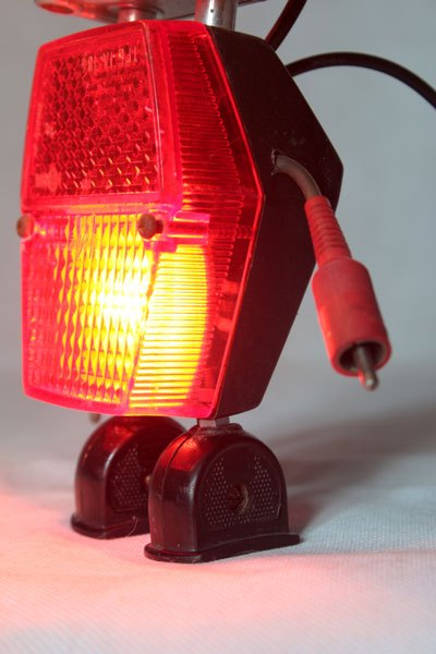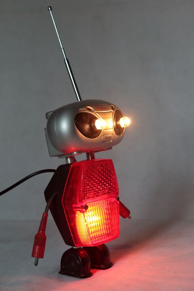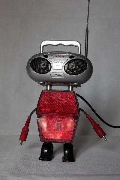 Robot radio et catadioptre, assemblage d’une mini radio (cadeau publicitaire), feu arrière de vélo, 2 prises électriques anciennes en bakélite et 2 fiches stéréo.
