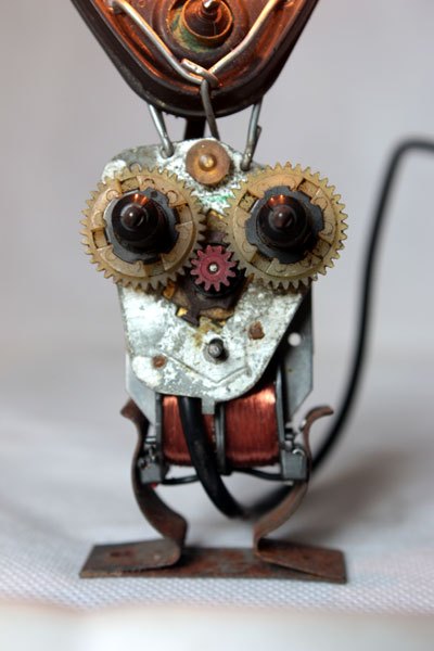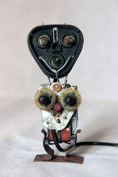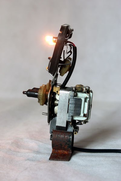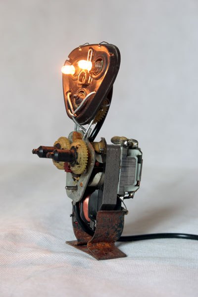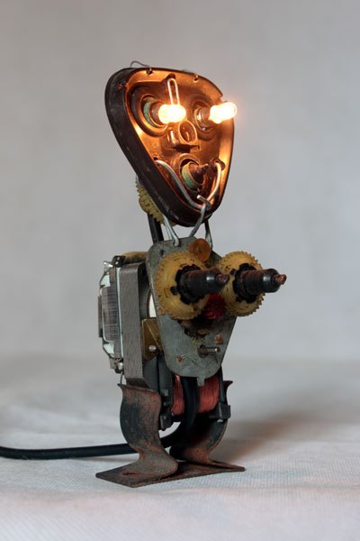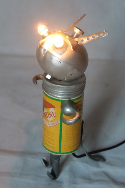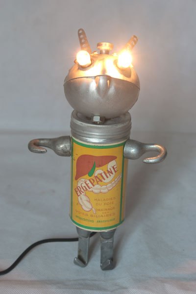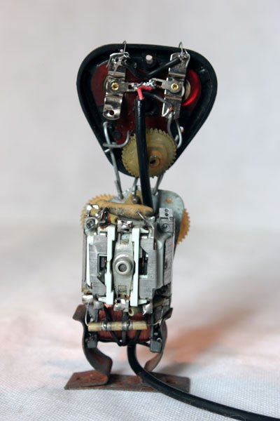 Sculpture robot rasoir démonté et recomposé. Assemblage en vase clos, recyclage électroménager.