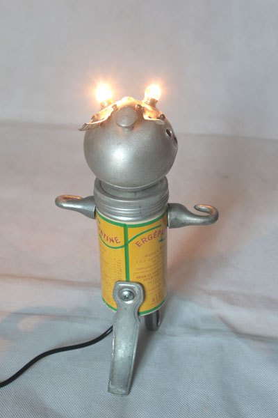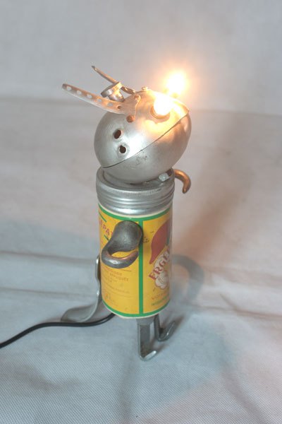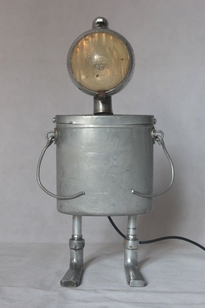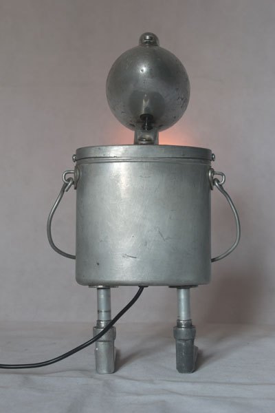 Assemblage lampe de vélo avec gamelle et clenches. aluminium et fonte d’aluminium, plastique. Détournement d’objets anciens, populaires, art