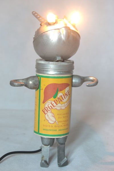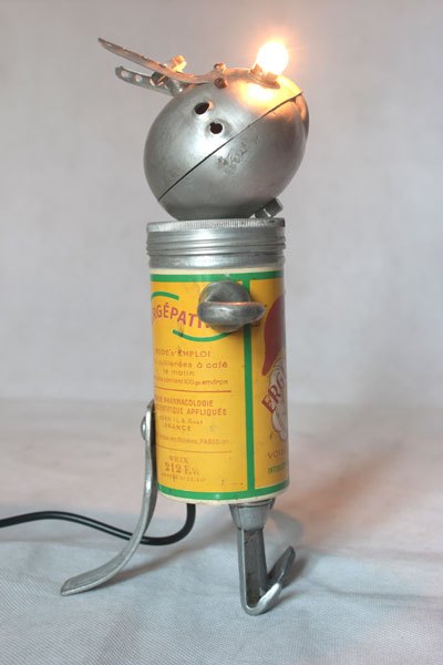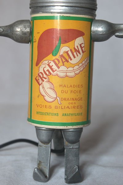 Bestiole alu assemblage d’objets: boite vintage de médicament Ergépatine, 2 mini louches, 4 crochets de louche, 2 bigoudis anciens.