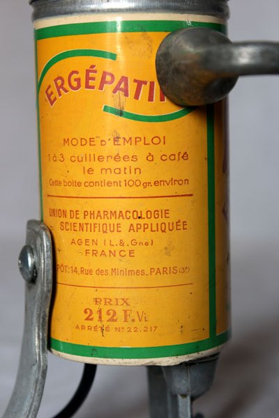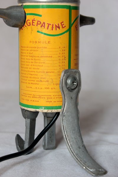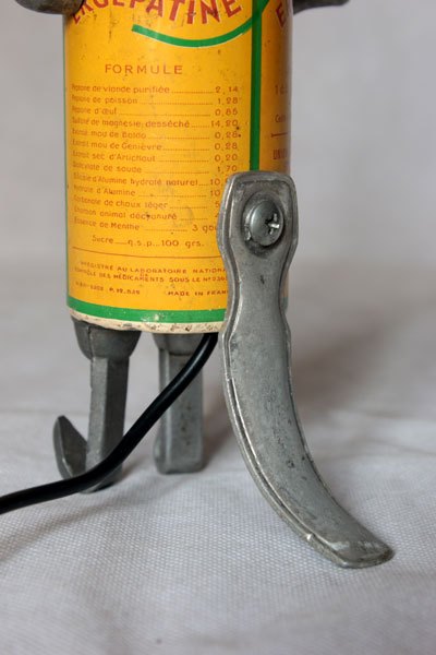 Composition: boite vintage de médicament Ergépatine, 2 mini louches, 4 crochets de louche, 2 éléments de bigoudis anciens .