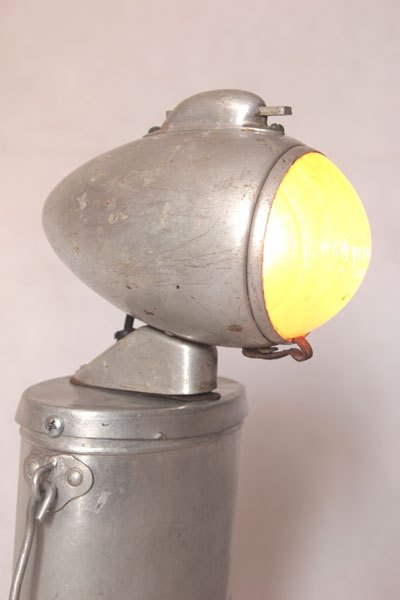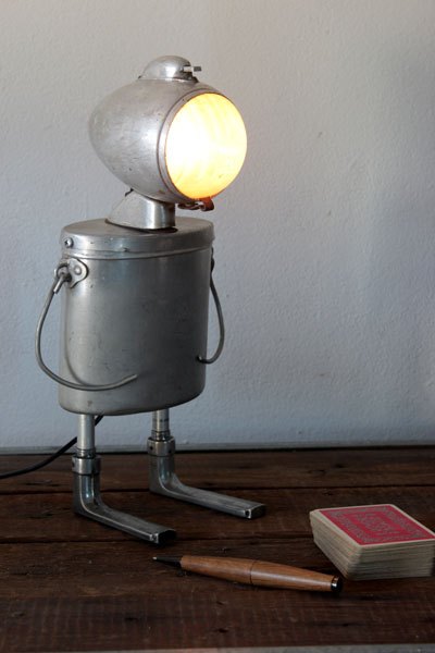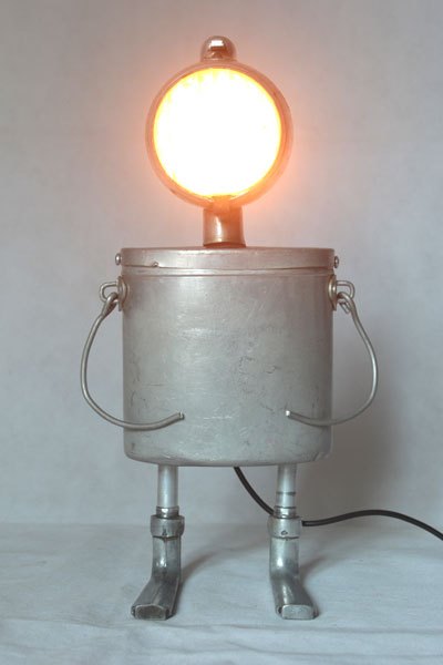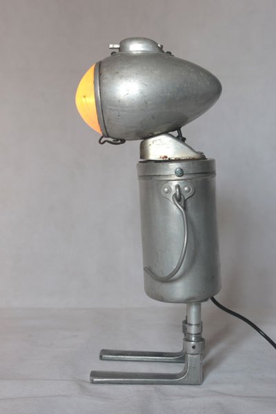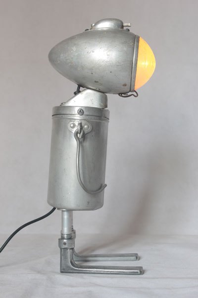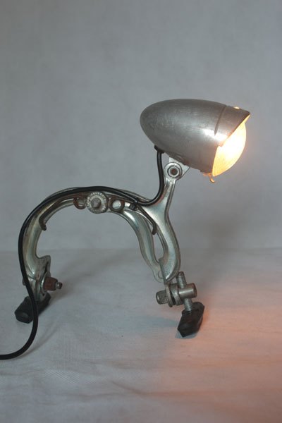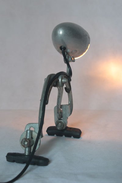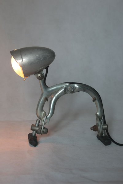 Assembly bicycle lamp with bowl and clenches. aluminum and cast aluminum, plastic. Diversion of old, popular objects, art.