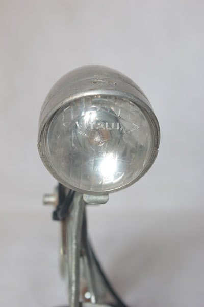 Optique de vélo ancien sur frein avec patins. Assemblage d’aluminium. Lampe sur pattes.