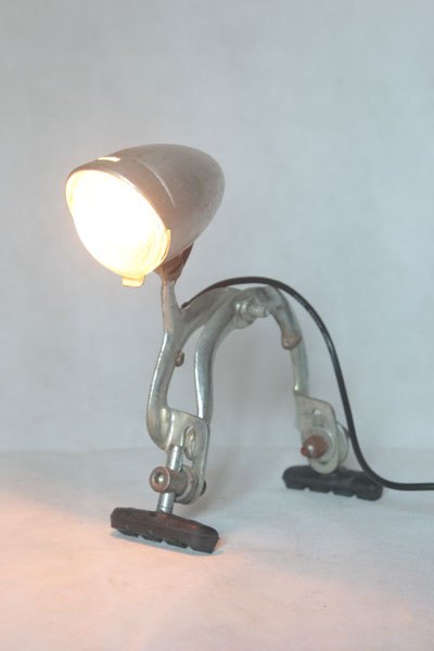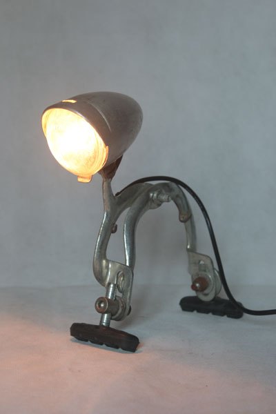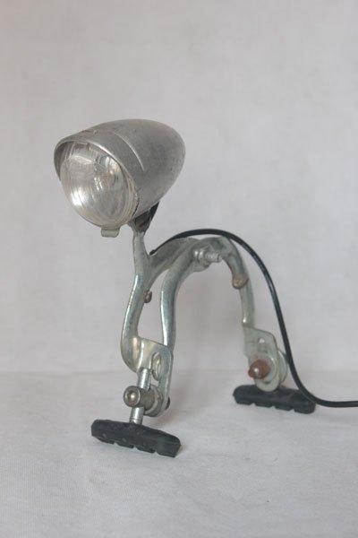 Old bicycle optics on brake with pads. Aluminum assembly. Lamp on legs.