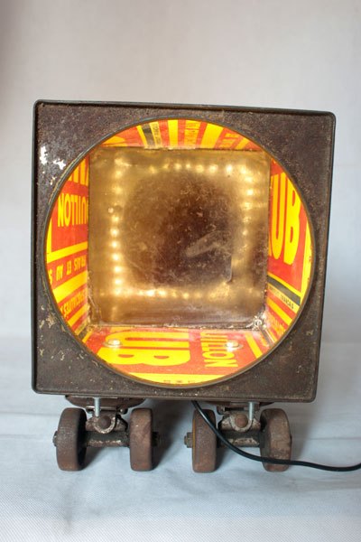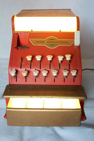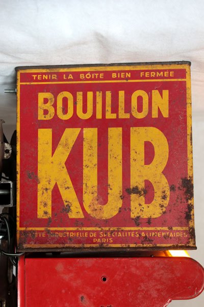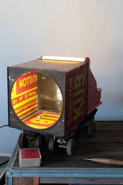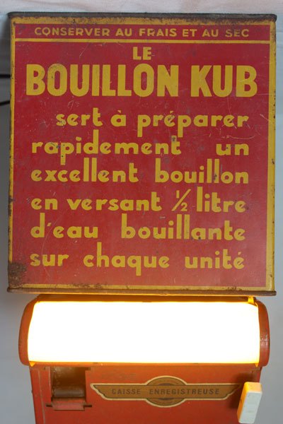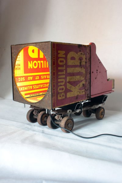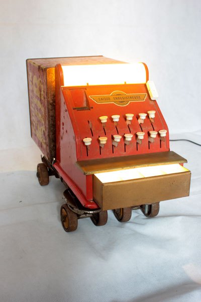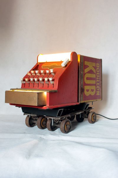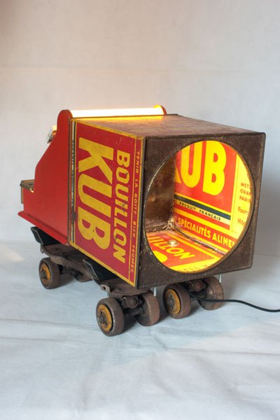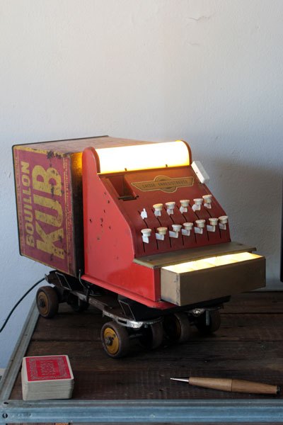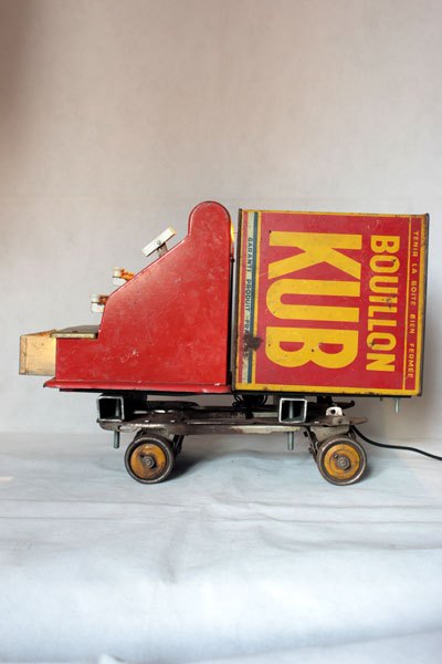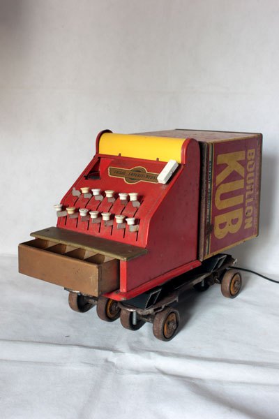 Camion rouge KUB assemblage d’une caisse enregistreuse pour enfants et d’une boite de bouillon KUB, sur deux patins à roulettes.
