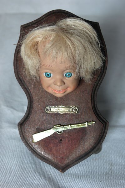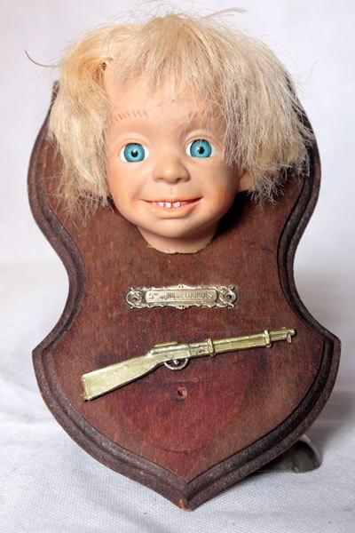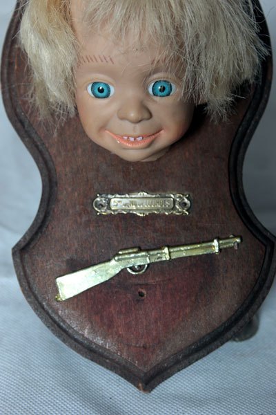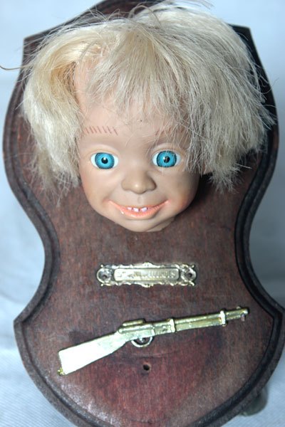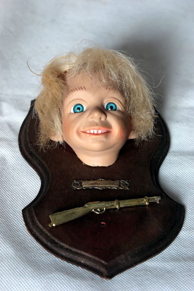 Composition: tête de poupée, fusil en plastique, plaque de bénitier « Notre dame de Lourdes ».