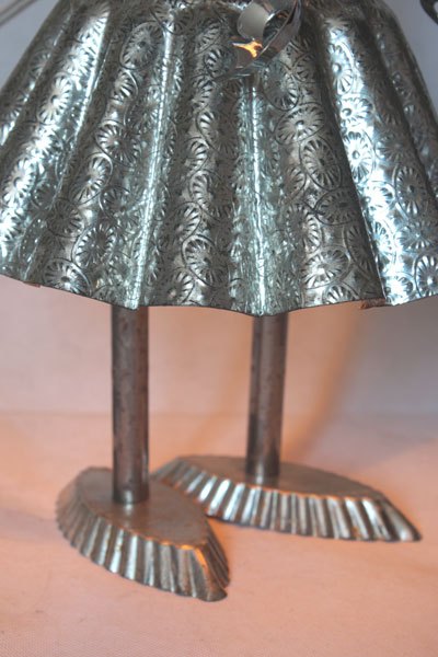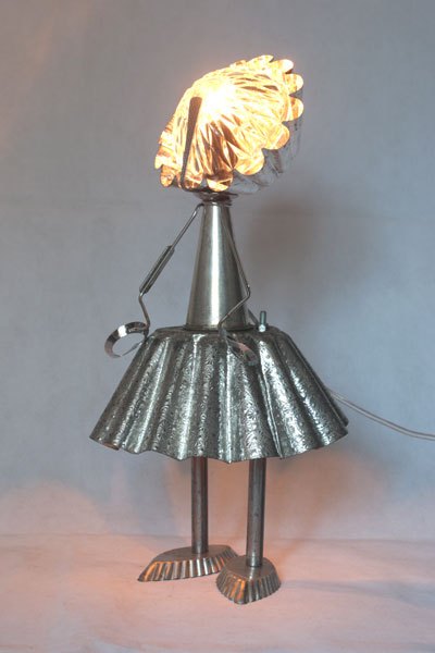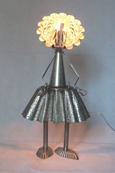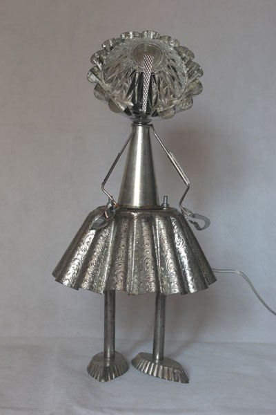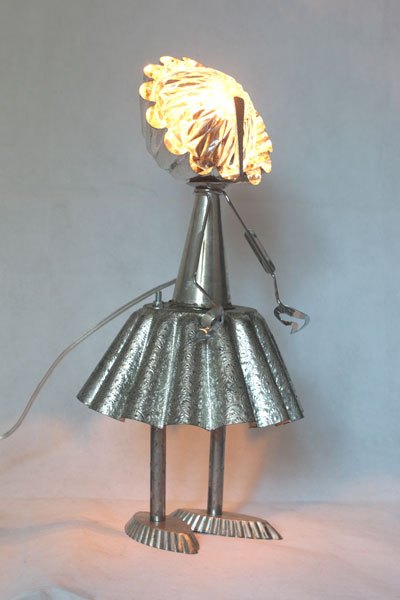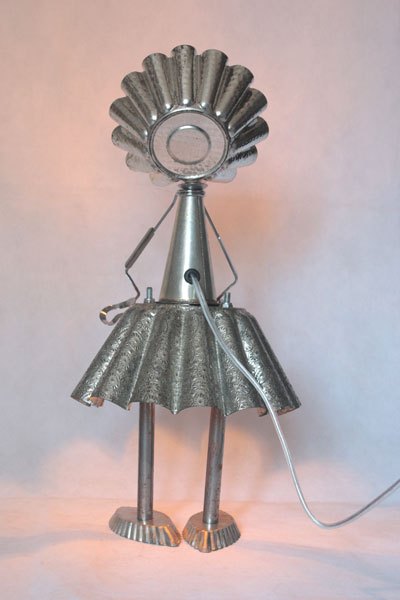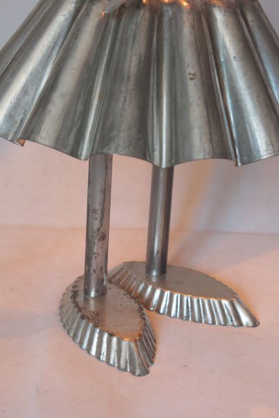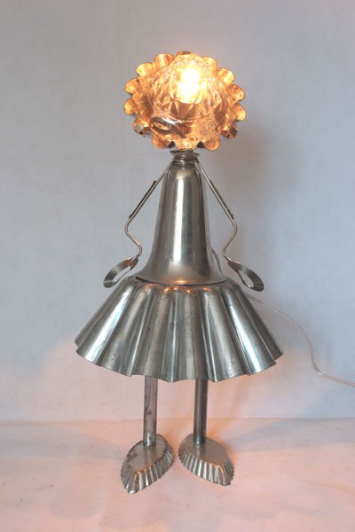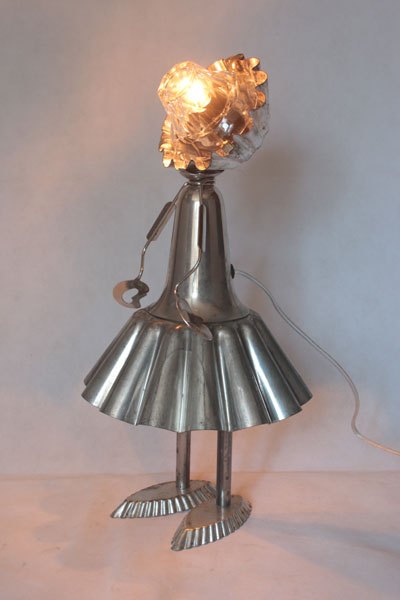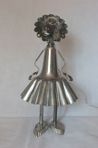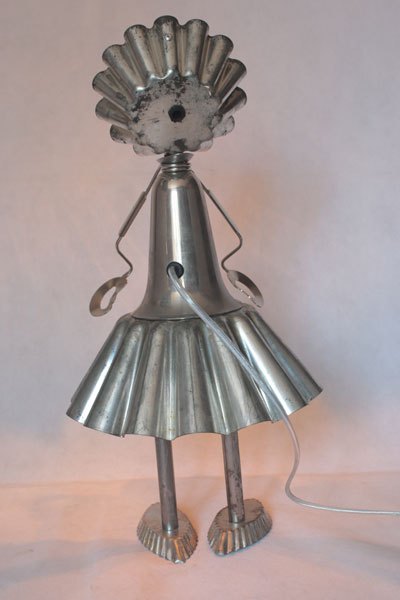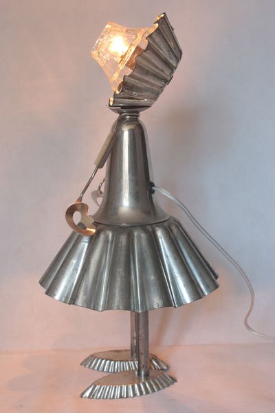 Misappropriation of cashmere mould, female character with cake moulds, cone, tray mould, snail claw, small spoon, bowl.