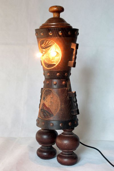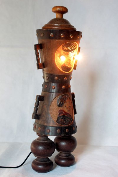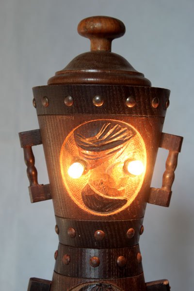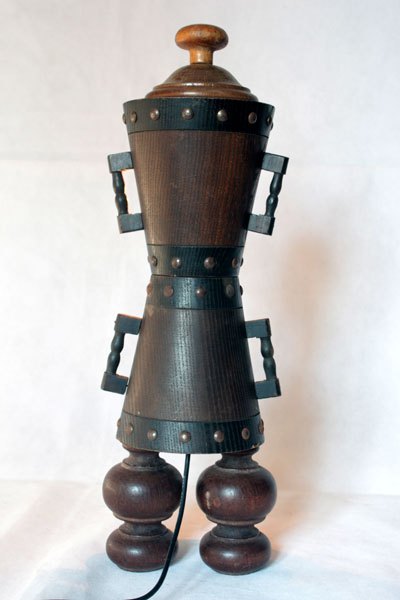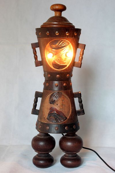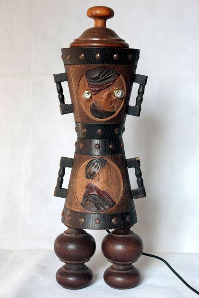 Sculpture of popular wooden objects, assembly of decorative pots couple of peasants.