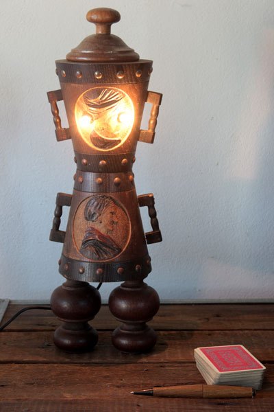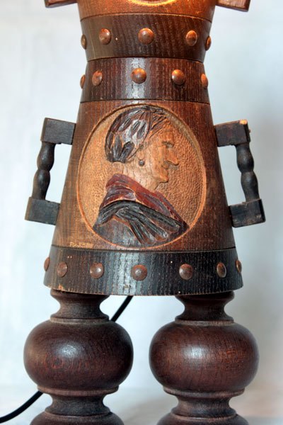 Sculpture d’objets populaires en bois, assemblage de pots décoratifs couple de paysans.