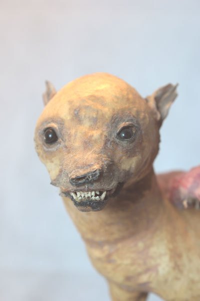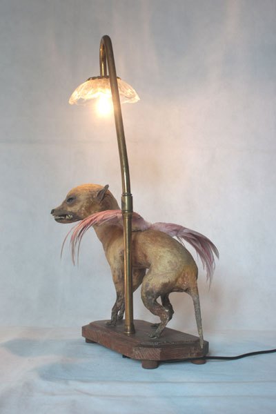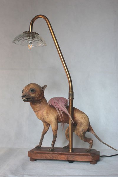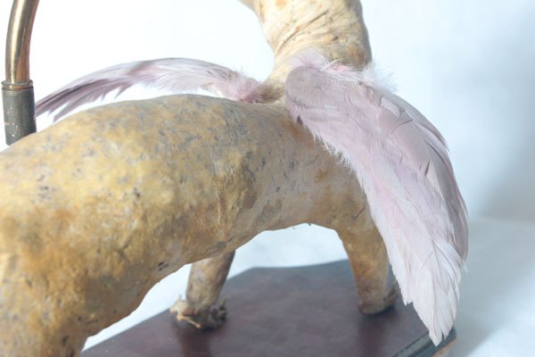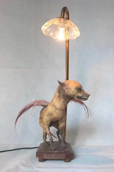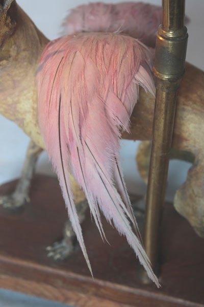 Composition: Chihuahua empaillé et dépoilé, plumes, verrerie.