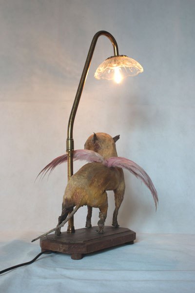 Winged fox chimera, stuffed and unpacked, with feathers and glassware.
