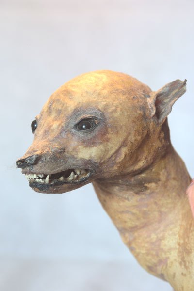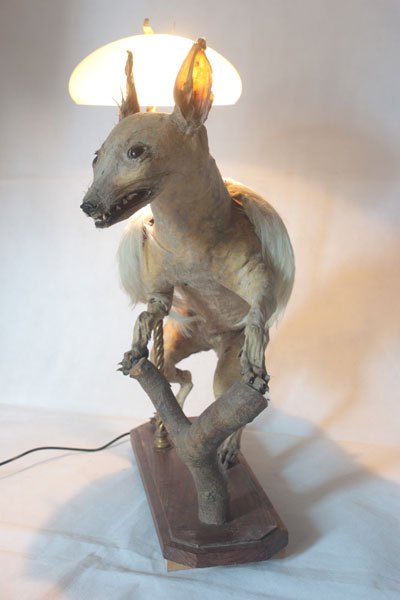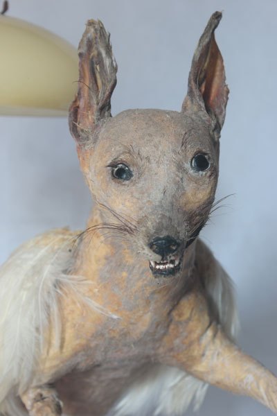 Chihuahua ailé, empaillé et dépoilé, assemblage avec verrerie.