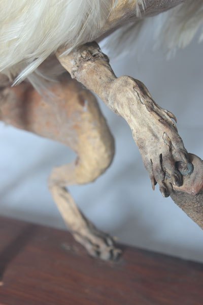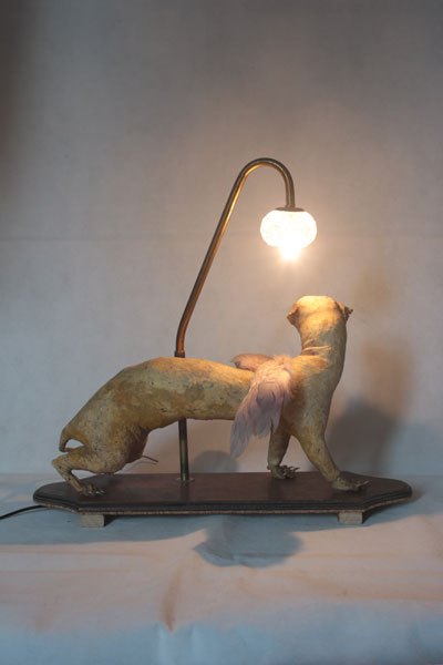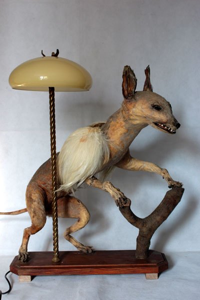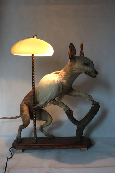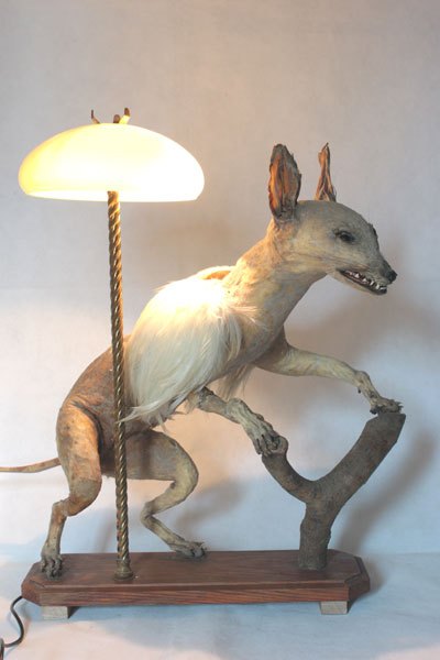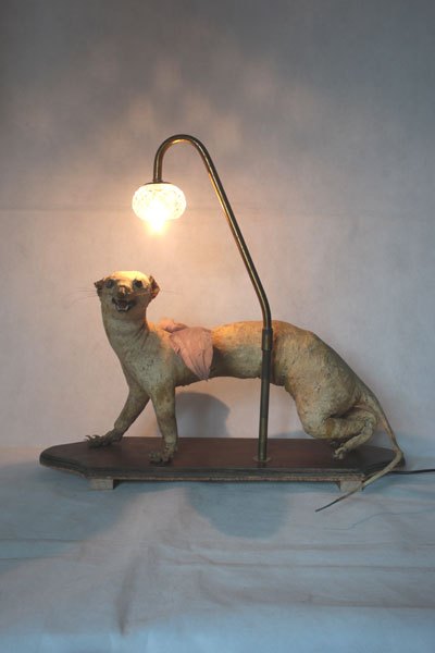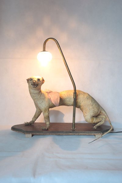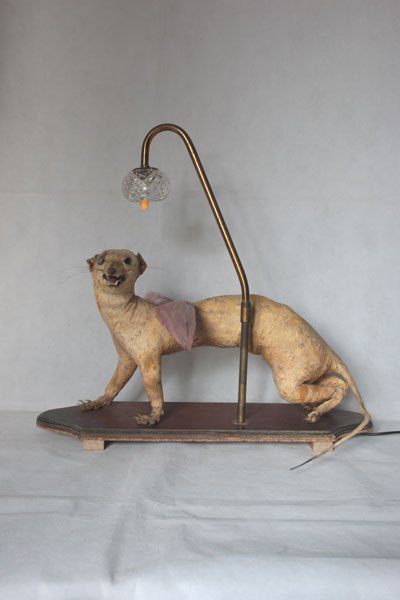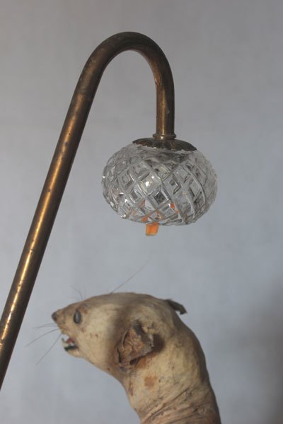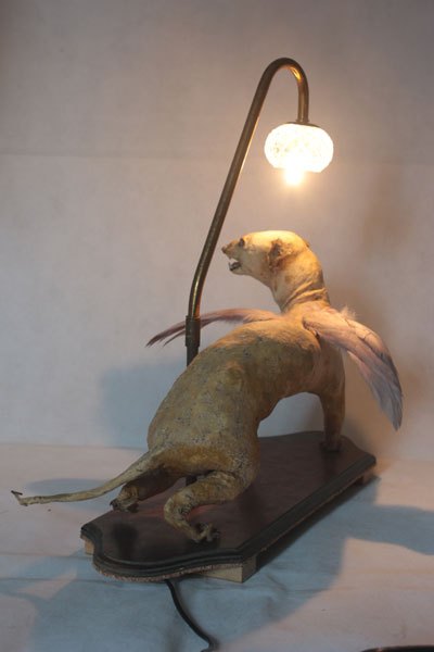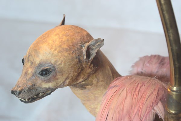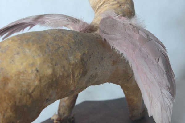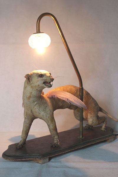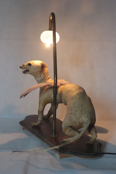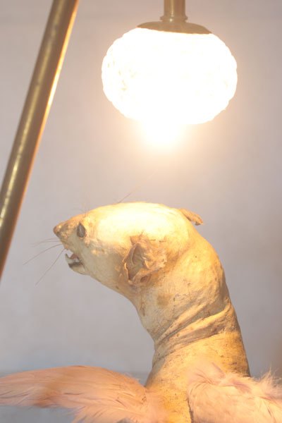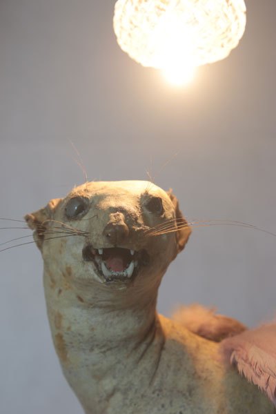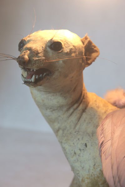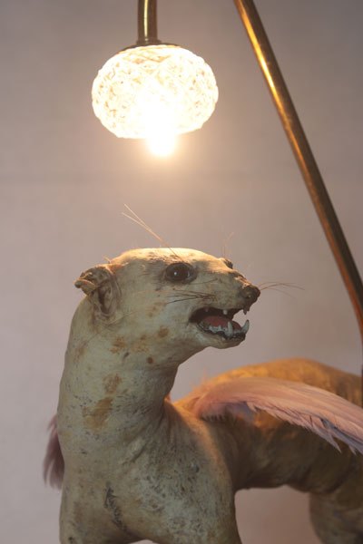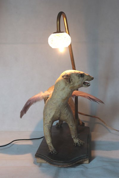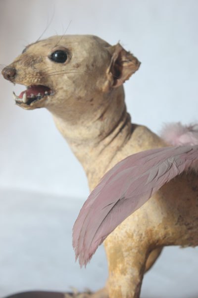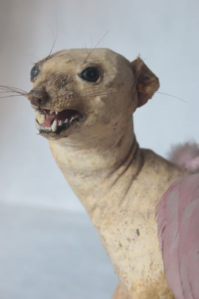 Curiosity booth, winged weasel. Animal recycling stuffed and unpacked, with feathers and glassware.