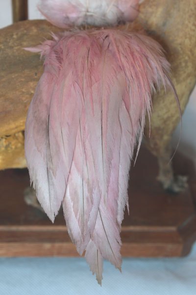Matières: bois, verre, laiton, cuir, paille, plumes.
