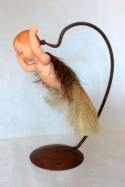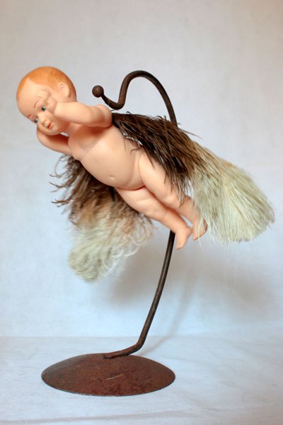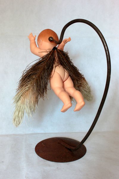 Bébé ailé, assemblage poétique sur un support en acier.