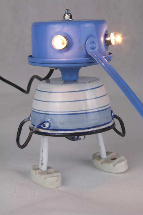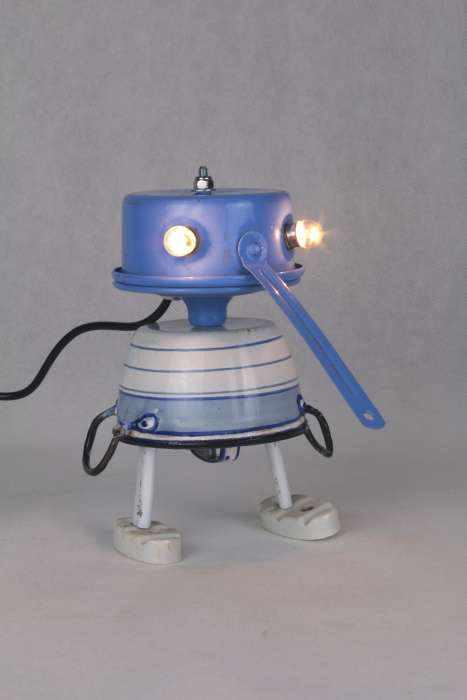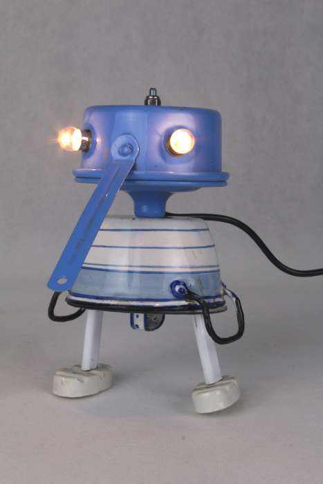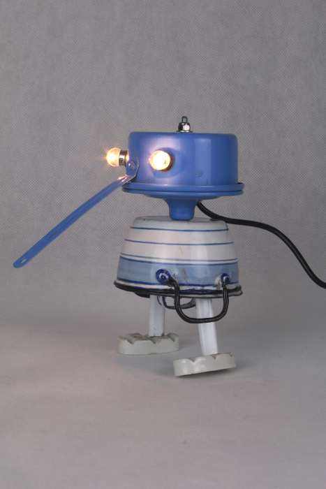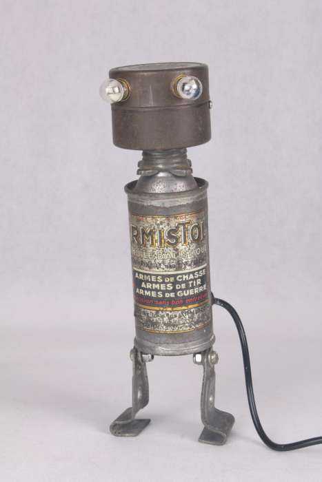 Personnage par assemblage de boites anciennes « pastilles Vichy-état » et « Bêtises de Cambrai », embouts de poche à douille de pâtisserie.