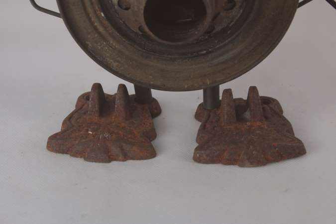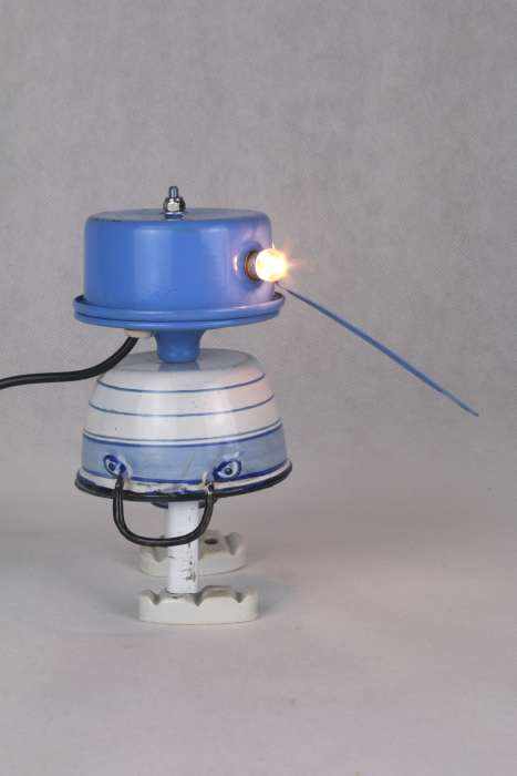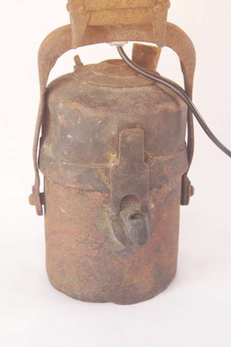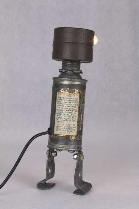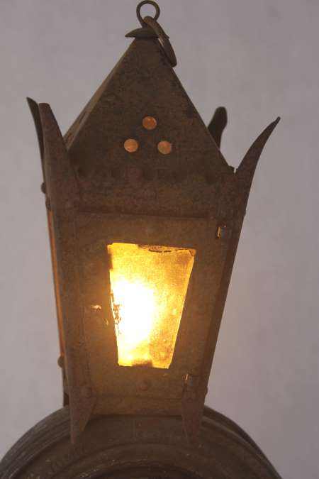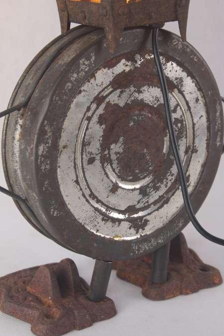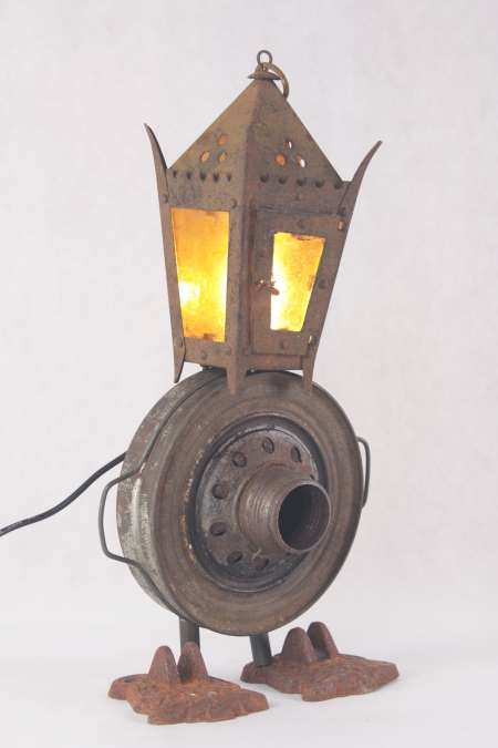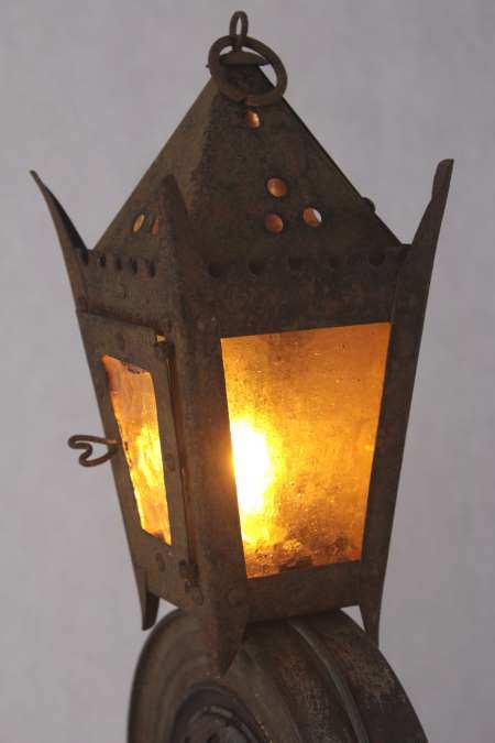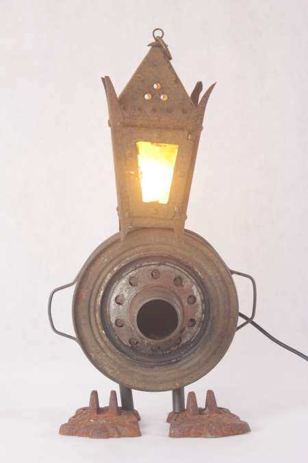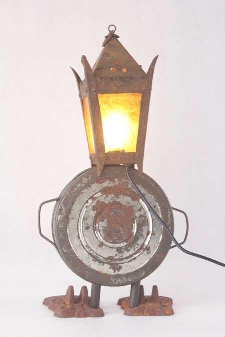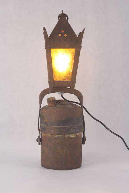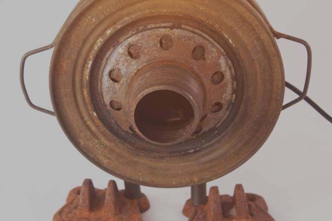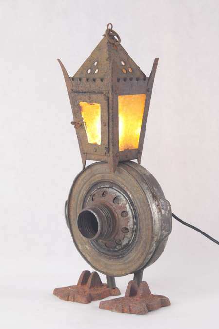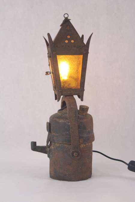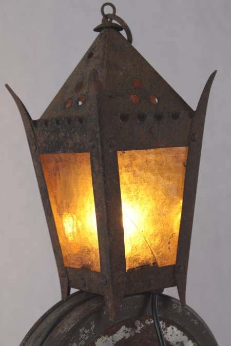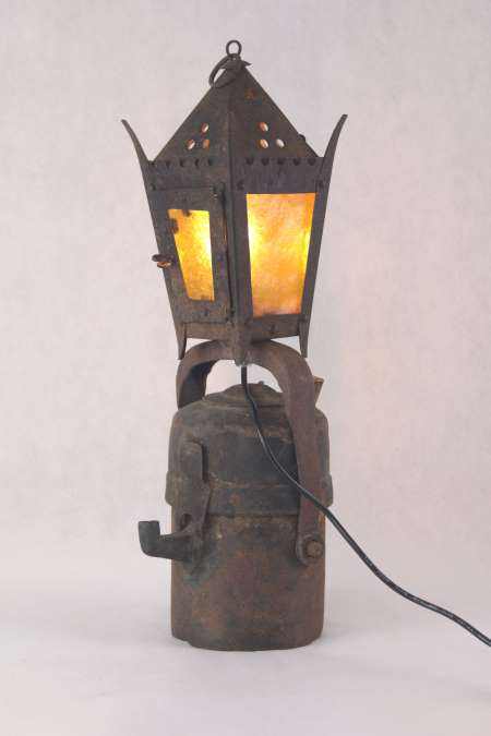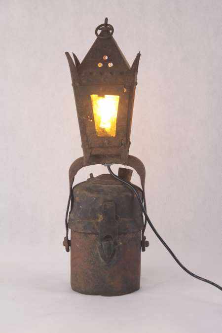 Assemblage lumineux d’éléments rouillés. Assemblage d’une lanterne et d’une boite à poudre.