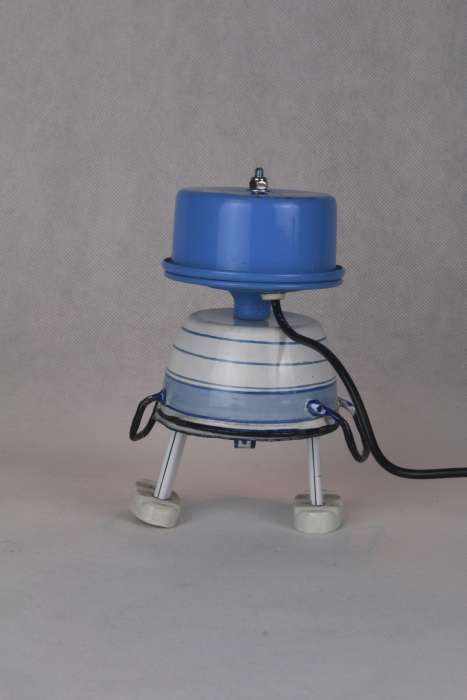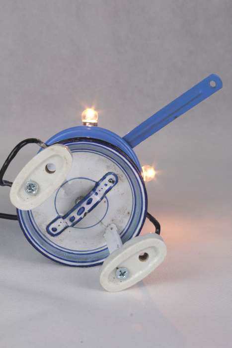 Assemblage d’éléments de dinette: marmite en émail, petite casserole bleue et son couvercle. Petit pied en porcelaine d’isolants électriques.