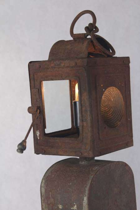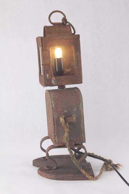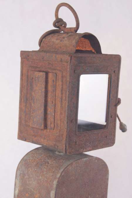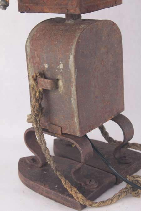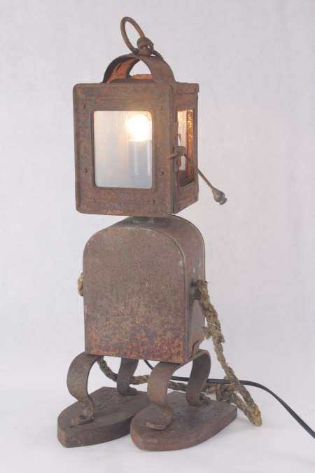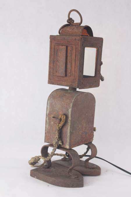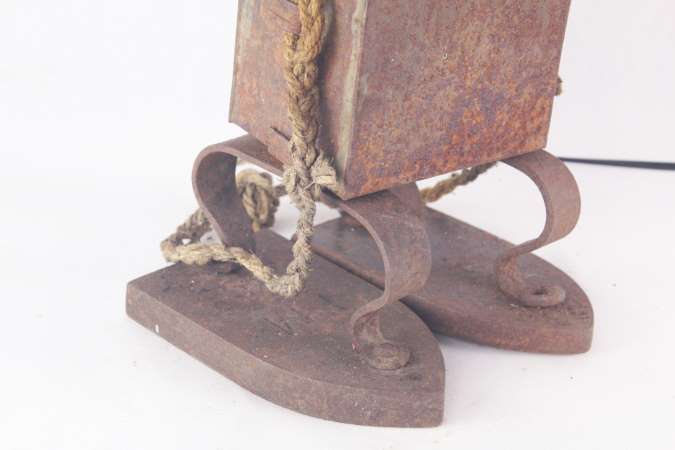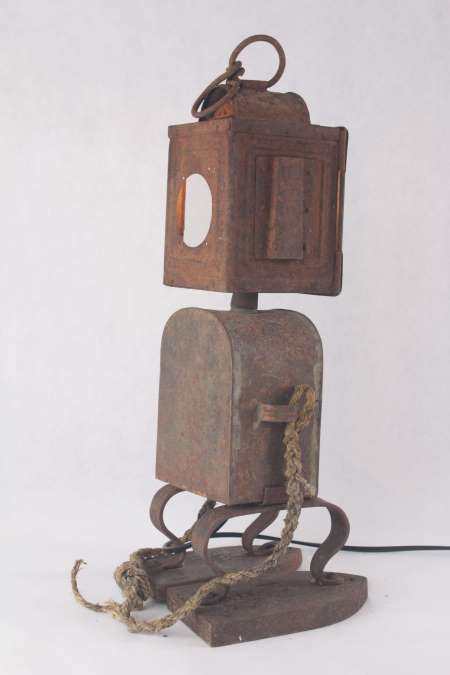 Personnage lumineux rouillé. Assemblage d’une lanterne, d’un bidon et deux fers à repasser en fonte.