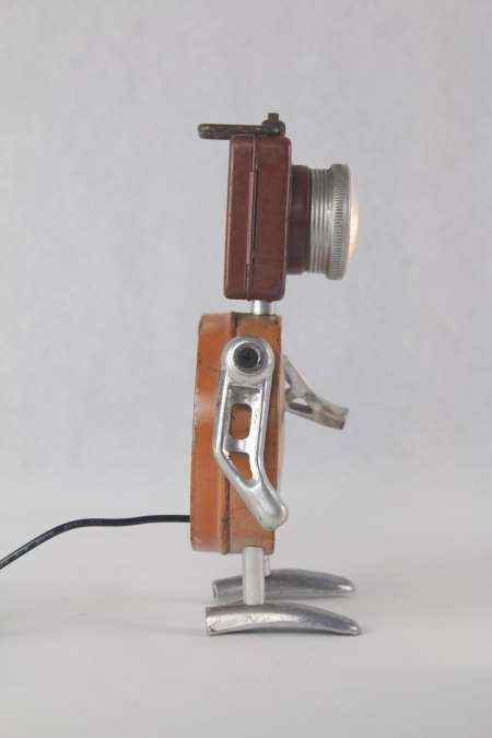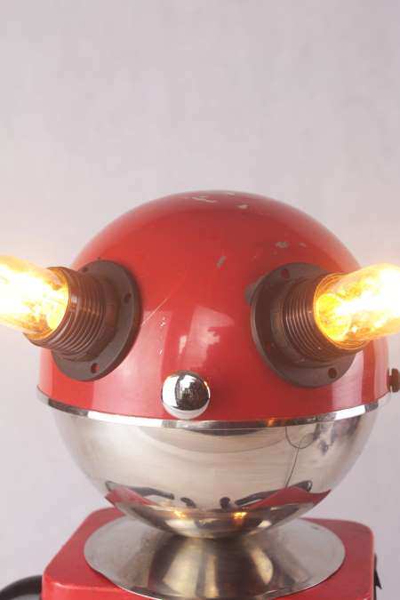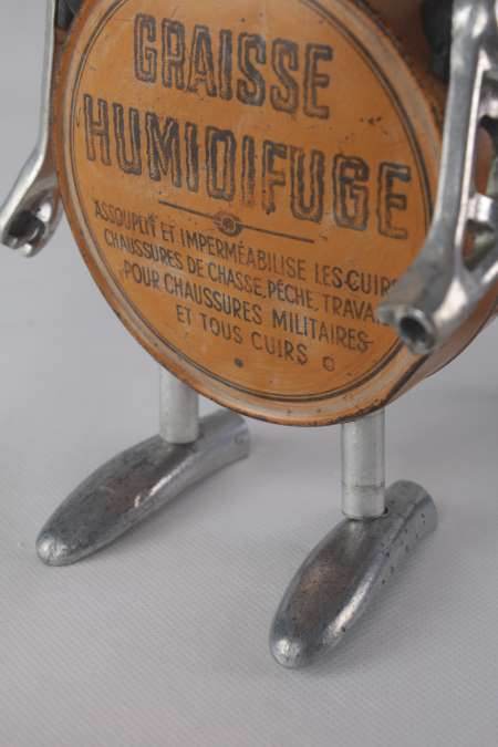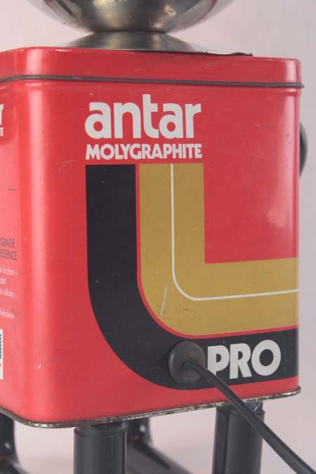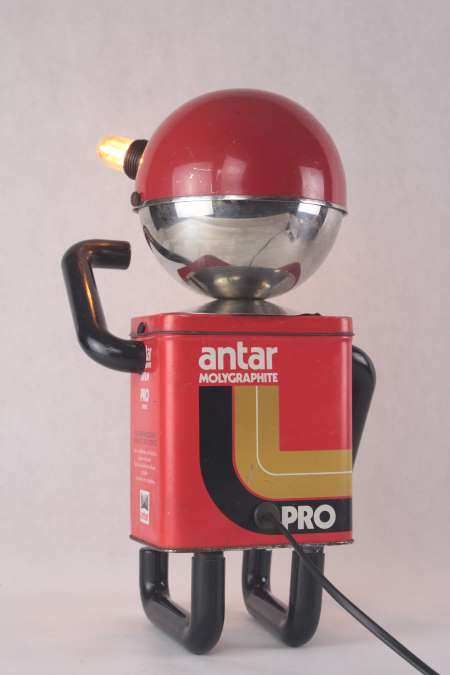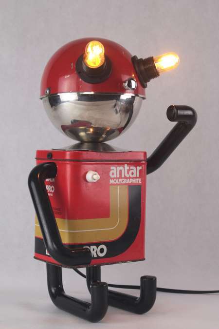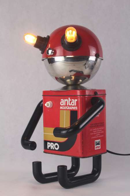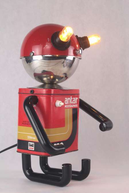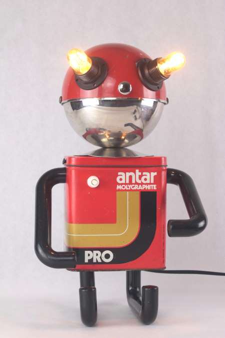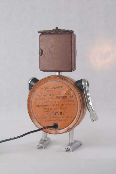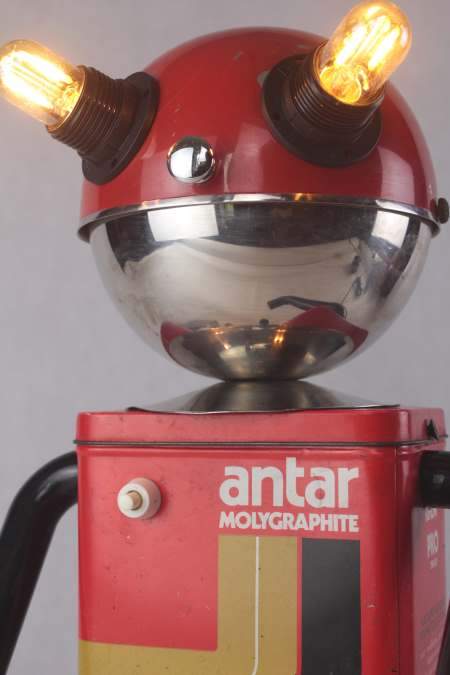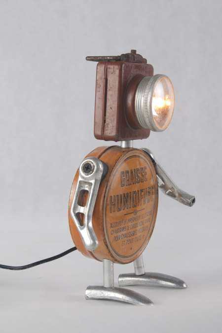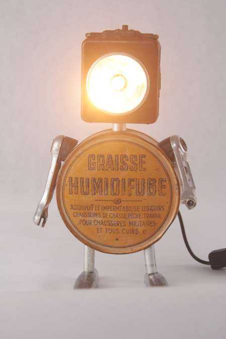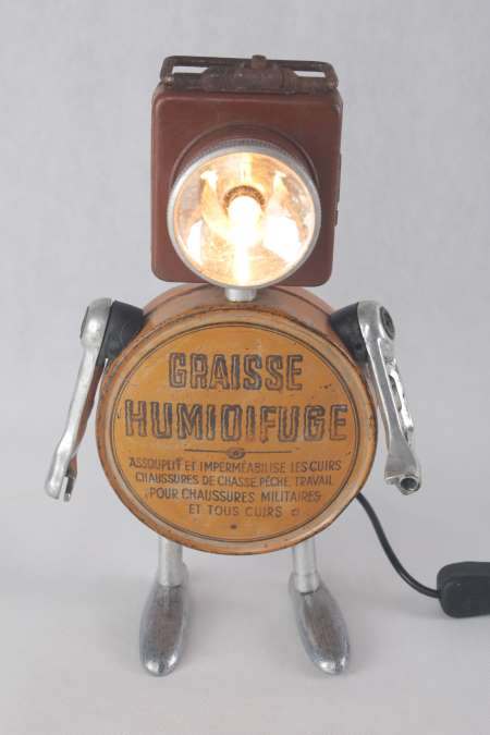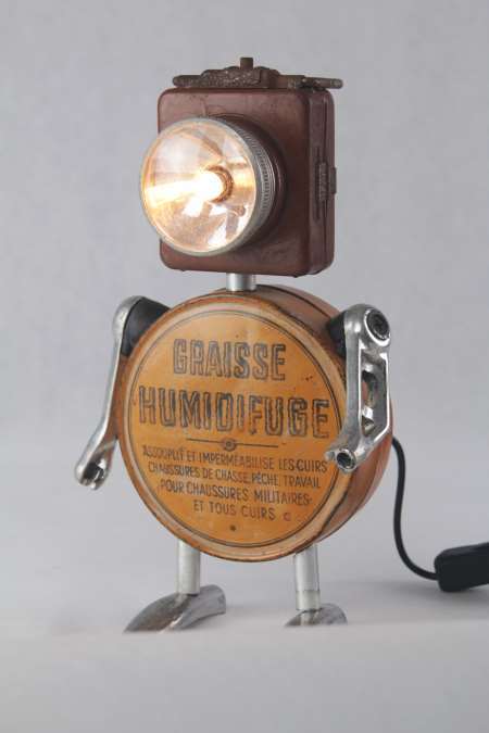 Personnage lumineux, association d’une boite ancienne « GRAISSE HUMIDIFUGE », une lampe de poche vintage, pièces de vélo, et manches d’ustensiles.