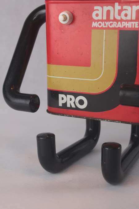 Personnage avec une boite rouge « antar MOLYGRAPHITE », un sucrier et 4 poignées de porte noires.