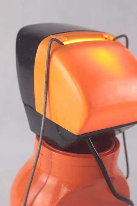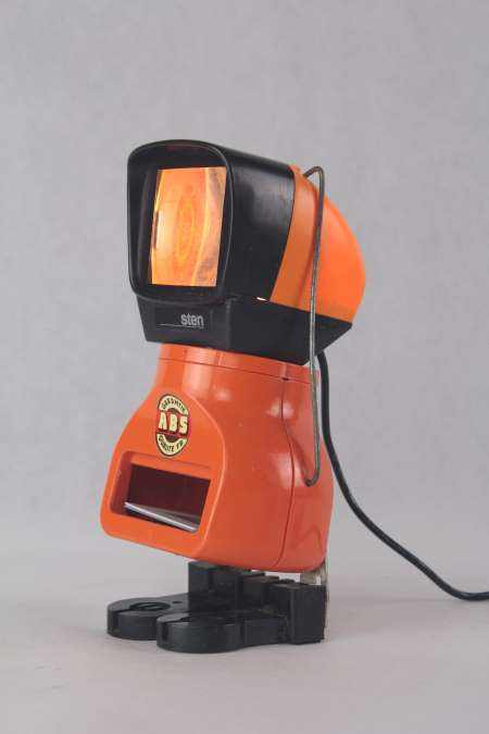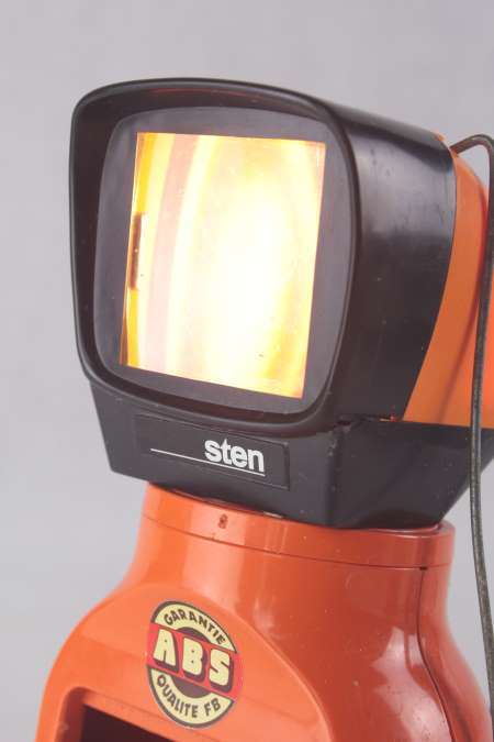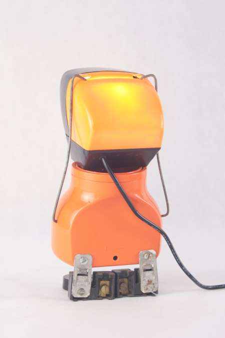 Association d’objets oranges : visionneuse de diapositives STEN, ustensile ABS, connecteurs de néons.